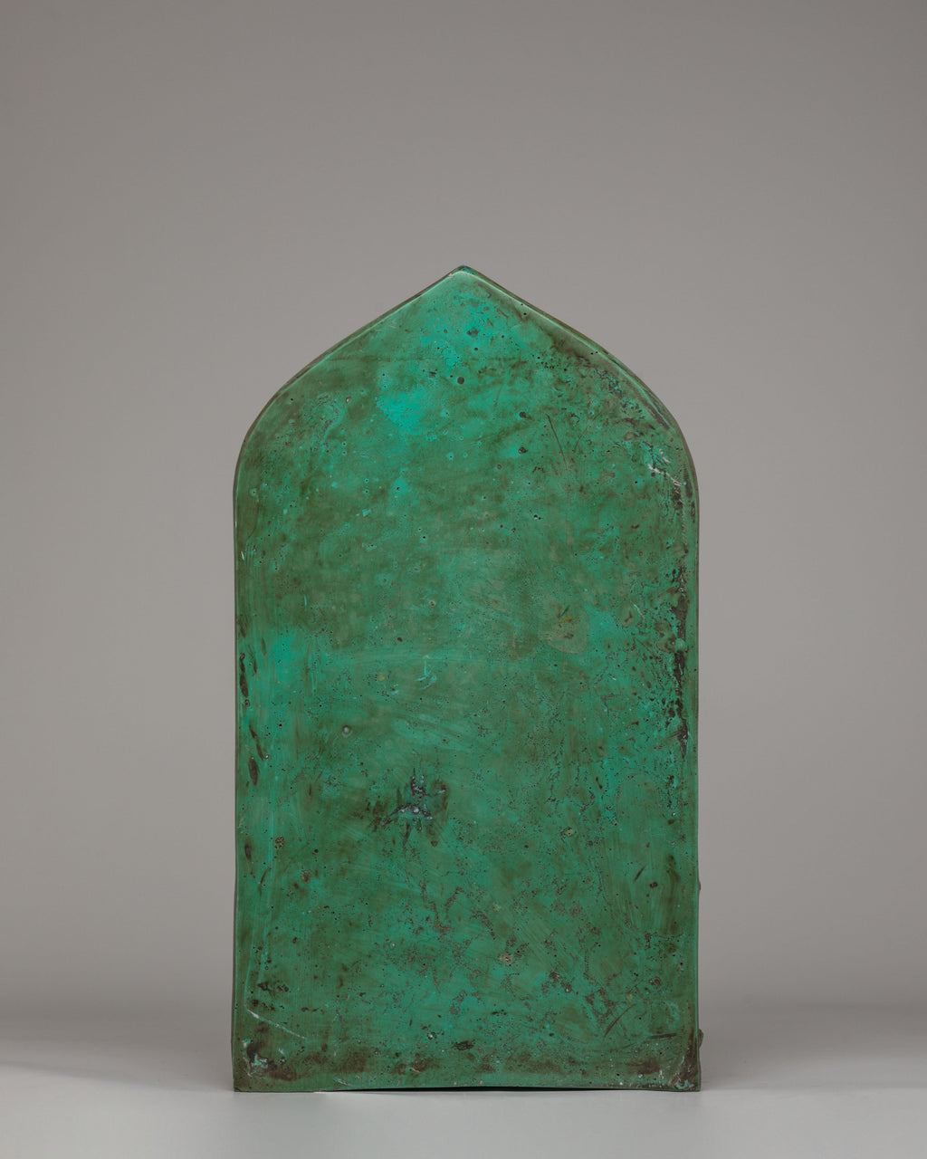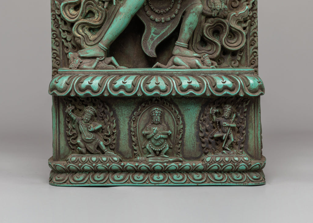 The design of this Chakrasambhara statue is rich in symbolism and meaning. The deity is depicted in an intense, dynamic posture, with multiple arms representing his ability to act in many ways to benefit sentient beings. The fiery motifs around his form symbolize the intense purification and transformative energy that Chakrasambhara embodies. The detailed carving in the stone-dust epoxy highlights the union of the divine couple, with Chakrasambhara and his consort depicted in a sacred embrace, symbolizing the completion of spiritual wholeness. The intricate border designs add a deep sense of connection to traditional Tibetan Buddhist art and Tantric symbolism.