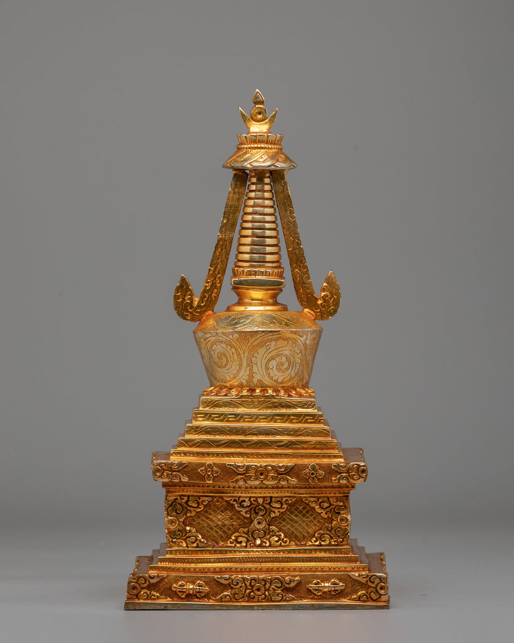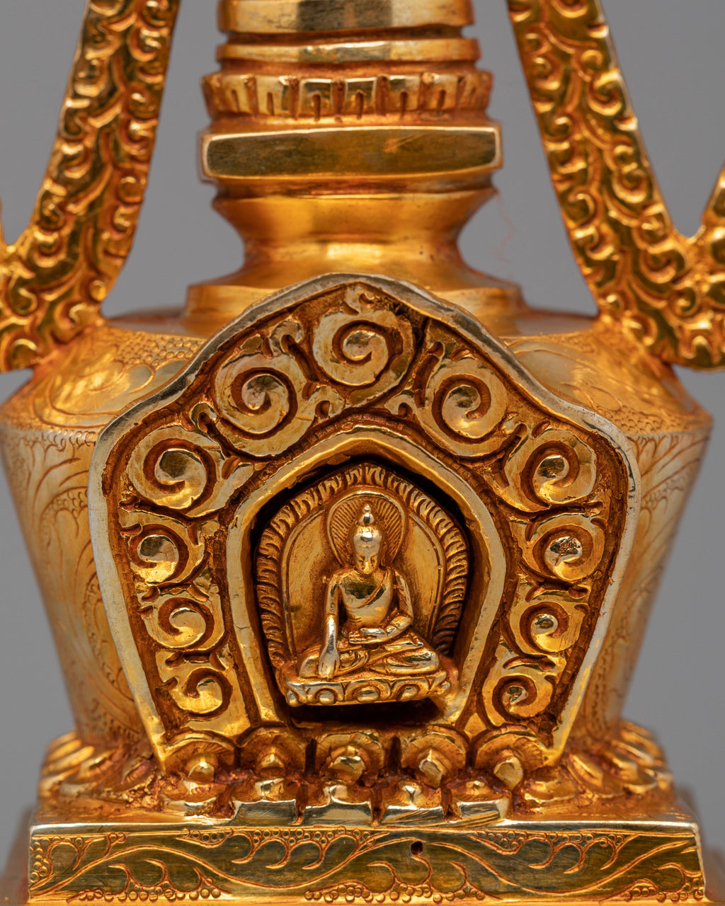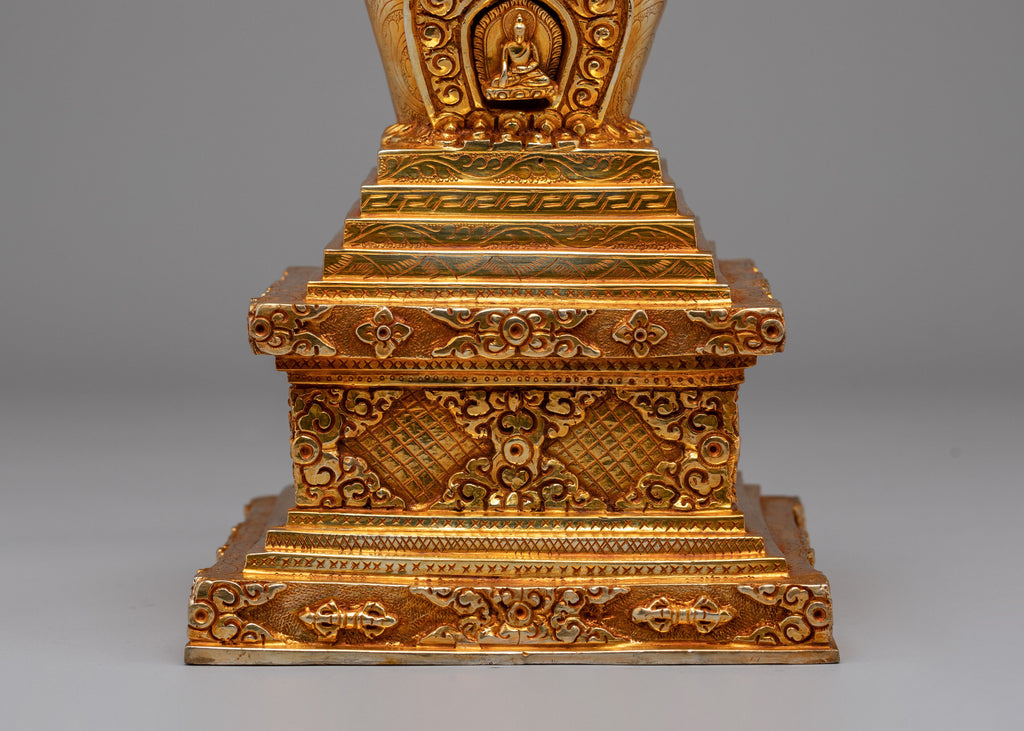 This Handmade Stupa For Buddhist Monument is a beautifully crafted ritual object used in Tibetan Buddhist practice to symbolize enlightenment and spiritual protection. Measuring 31 cm in height, 15.5 cm in width, and weighing 2.2 kg, it is made of a copper body with a mercury-gold-plated finish that radiates a divine glow. The stupa is adorned with intricate carvings and features, showcasing traditional Himalayan craftsmanship. Its design reflects the sacred symbolism of the stupa, embodying the path to awakening and the presence of enlightened energy.