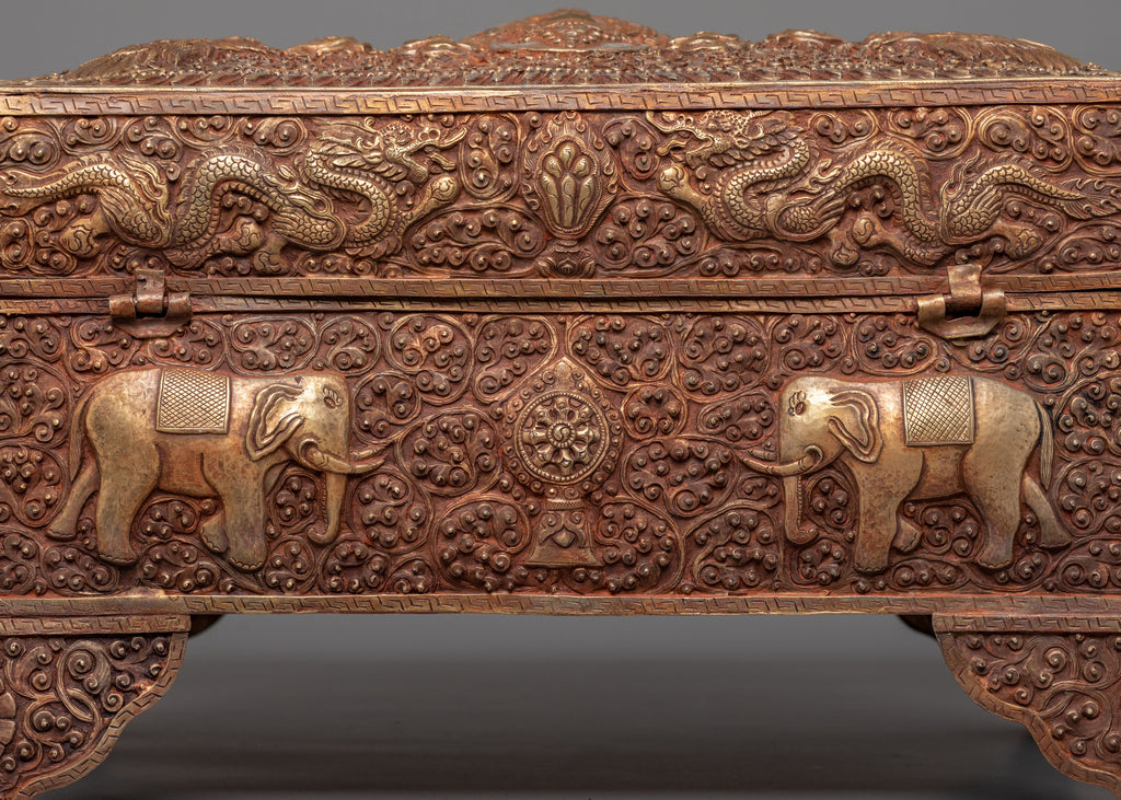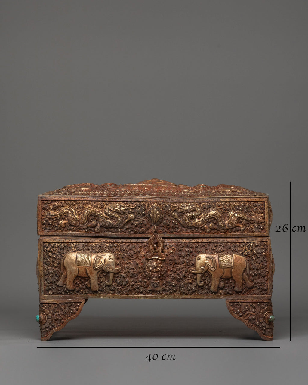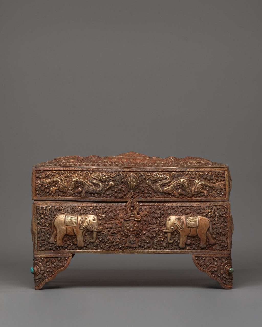 The box's exterior is covered with complex carvings of dragons and elephants, each expressing a depth of spiritual meaning. Dragons, guardians of wisdom and heavenly power, are thought to fend off evil and safeguard holy treasures. The elephants, which represent power, stability, and spiritual endurance, stand gracefully at the base, grounding the box's vitality. A Buddha image sits in the center, exuding peace and enlightenment, surrounded by floral and scroll patterns that represent balance and cosmic harmony. The precise craftsmanship on each panel demonstrates the artisan's dedication and mastery of traditional Tibetan metallurgy.