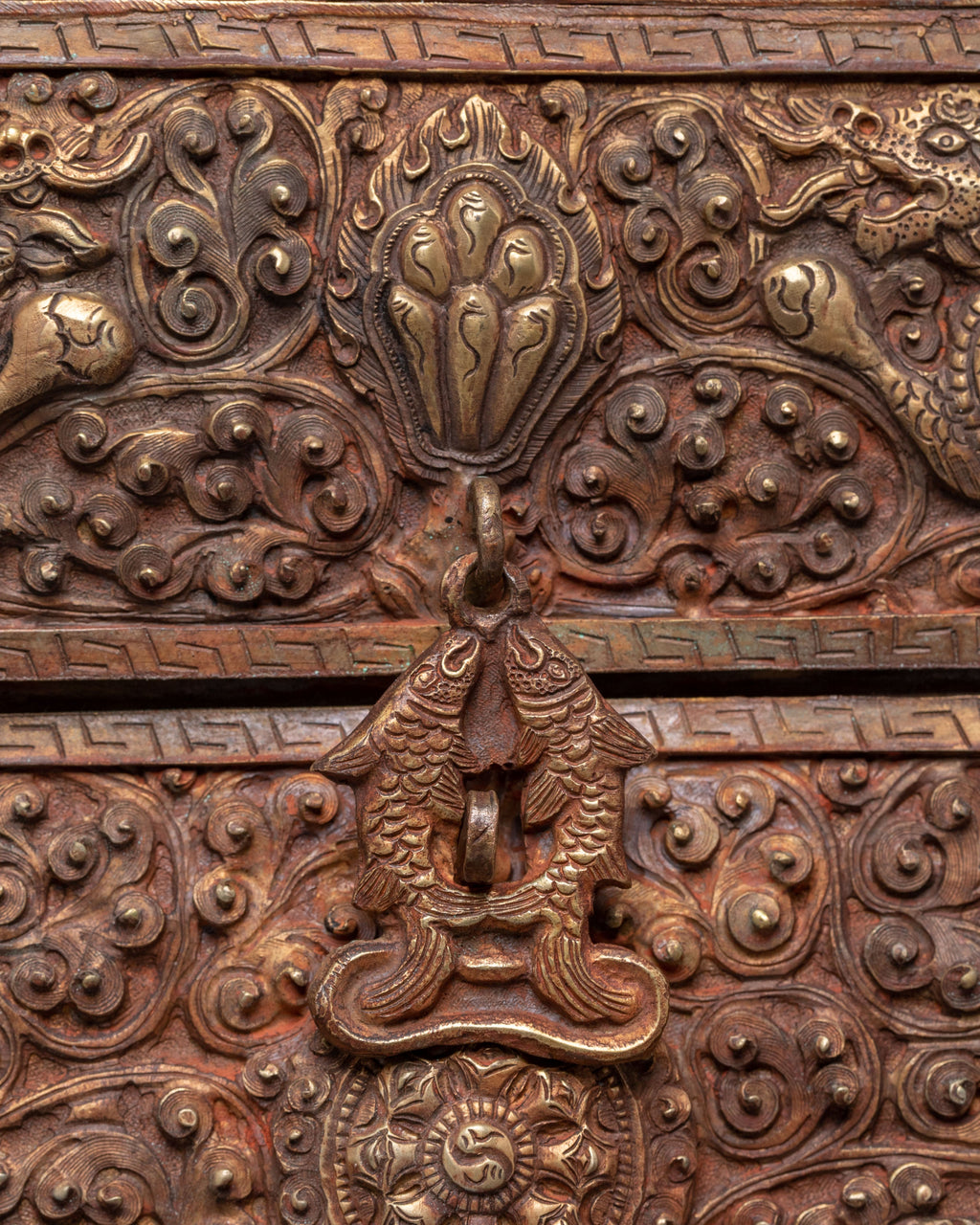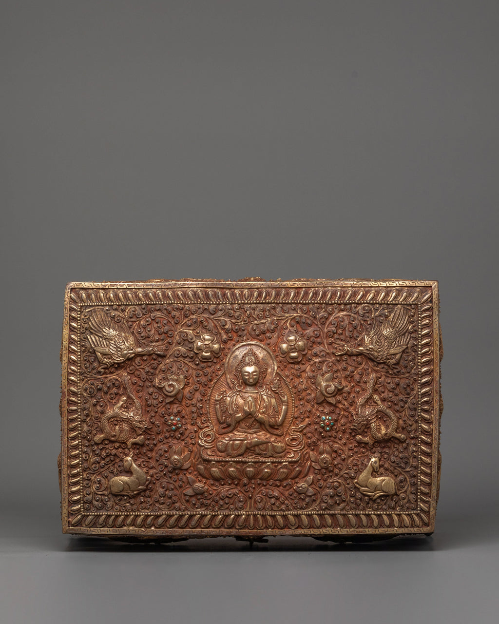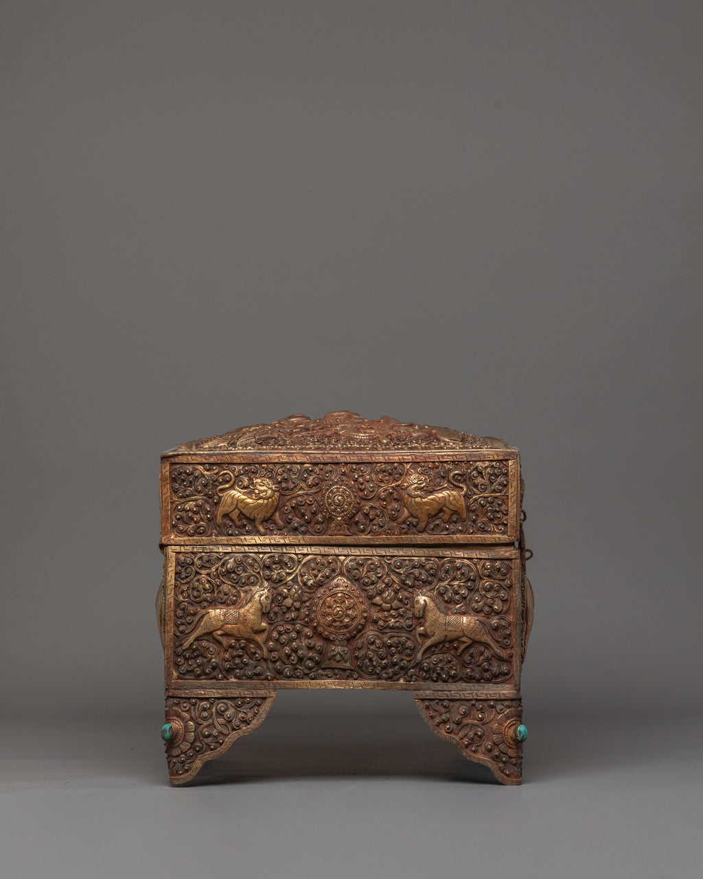 The box's exterior is covered with complex carvings of dragons and elephants, each expressing a depth of spiritual meaning. Dragons, guardians of wisdom and heavenly power, are thought to fend off evil and safeguard holy treasures. The elephants, which represent power, stability, and spiritual endurance, stand gracefully at the base, grounding the box's vitality. A Buddha image sits in the center, exuding peace and enlightenment, surrounded by floral and scroll patterns that represent balance and cosmic harmony. The precise craftsmanship on each panel demonstrates the artisan's dedication and mastery of traditional Tibetan metallurgy.