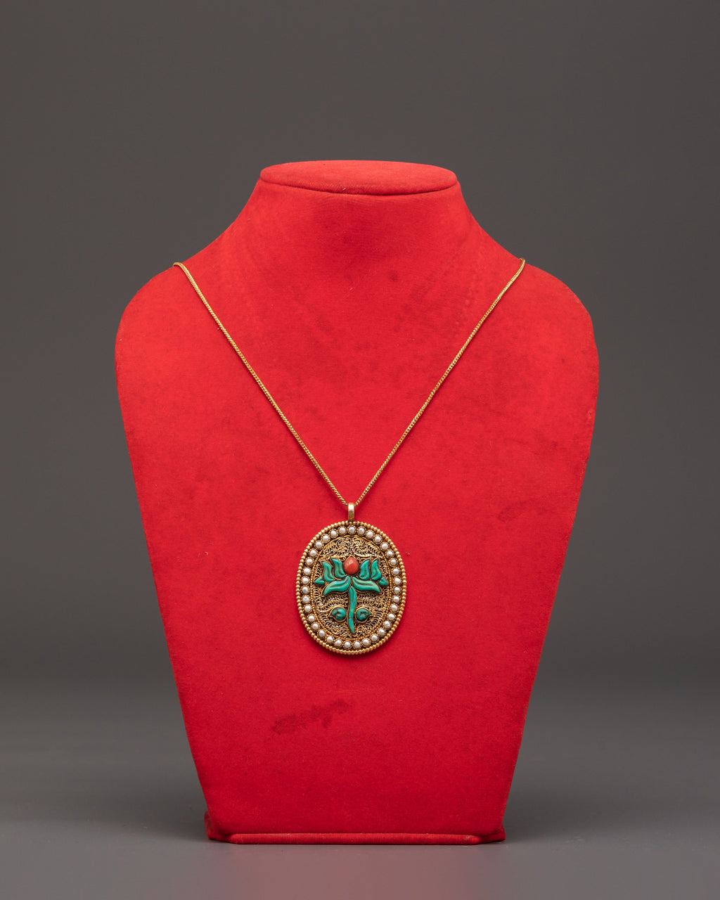 Immerse yourself in the harmonious blend of elegance, spirituality, and tradition with this Handmade Tibetan Locket featuring Beautiful Detailing. Crafted with precision from silver and gold plating, this piece measures 39cm in height and 3.2cm in width. It weighs just 0.032kg, offering a lightweight yet striking accessory perfectly suited for daily wear, spiritual practices, or meditation. The locket is adorned with authentic semi-precious stones, pearls, turquoise, and coral, each carrying profound spiritual symbolism in Tibetan culture. Turquoise is valued for its protective energy and connection to wisdom, coral symbolizes vitality and spiritual growth, while pearl signifies purity and clarity of mind.