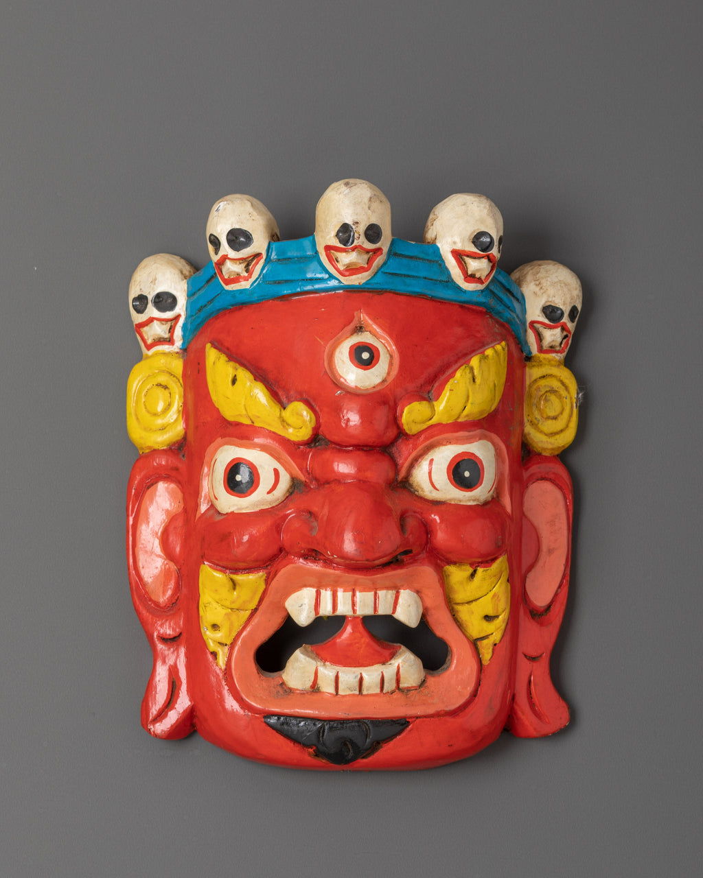 This authentic Tibetan Protective Deity Wall Mask represents one of the most powerful guardian spirits in Himalayan Buddhist tradition. Handcrafted from wood and painted with vibrant acrylic colors, this Buddhist wrathful deity mask features the characteristic fierce red face with bulging eyes, flaming eyebrows, and bared white fangs that symbolize the deity's power to ward off evil spirits and negative energies. The crown of five skulls adorning the top represents the transformation of the five poisons into wisdom, while the third eye on the forehead signifies omniscient awareness that sees through all illusions and protects devotees from harm.