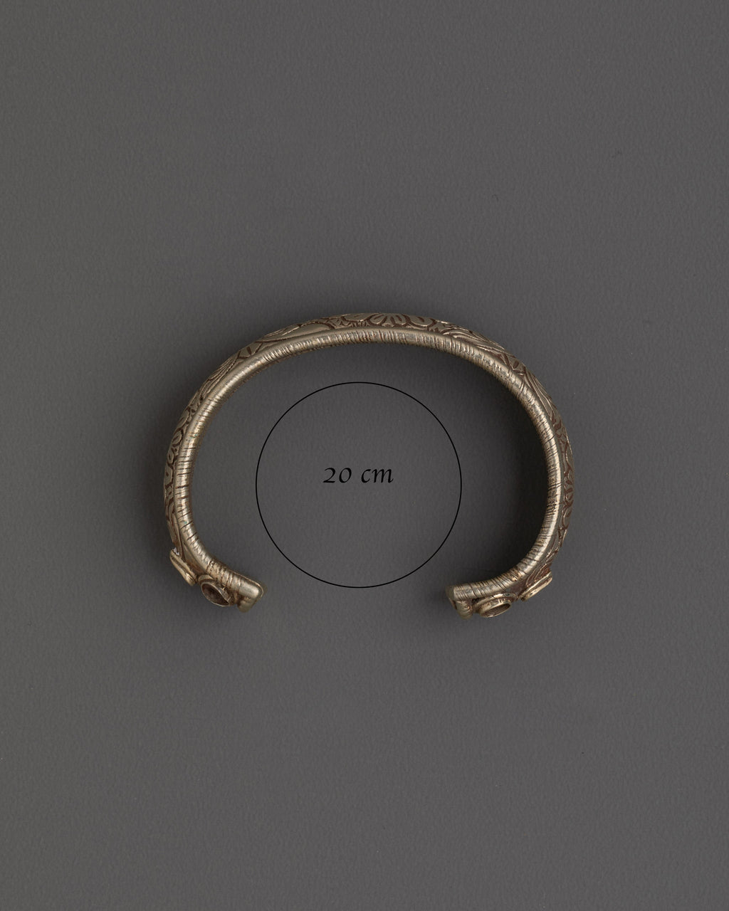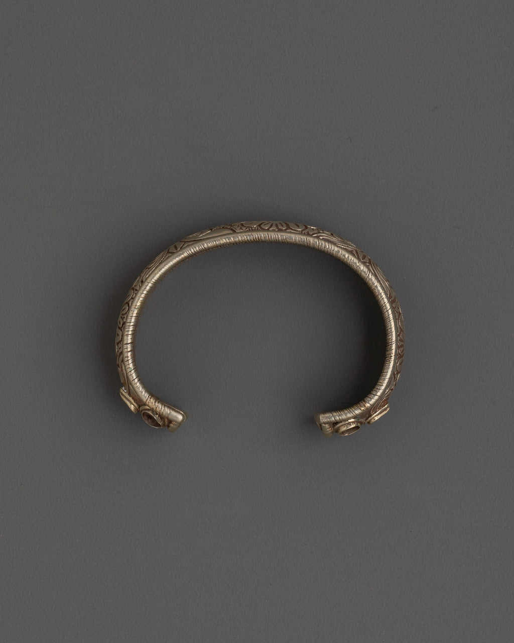Expertly crafted from white metal, this bracelet showcases intricate hand-etched patterns that symbolize protection and continuity. Its oxidized finish imparts a vintage, time-worn appearance, paying tribute to ancestral jewelry passed down through generations. Perfect for spiritual connection, cultural appreciation, or stylish expression, this versatile bracelet suits meditation, ceremonies, festivals, or everyday boho looks. Embrace the beauty of tribal jewelry with this handcrafted white metal bracelet, a perfect representation of skilled artisanship and unique design. Whether you’re drawn to the bohemian lifestyle or love handmade jewelry, this bracelet will add character and charm to your collection.