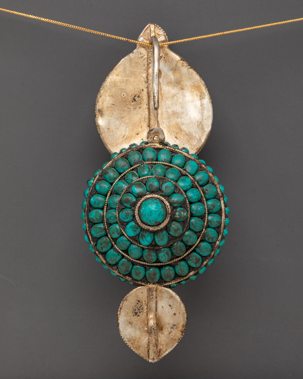 The earrings feature intricate motifs of turquoise stones, forming layered mandala patterns that symbolize protection, spiritual energy, and harmony. The detailed turquoise work, highlighted by the polished silver accents, creates depth and dimension, reflecting the artistry behind traditional handmade jewelry. Their bold design makes them ideal for those who value both beauty and cultural symbolism in accessories.
