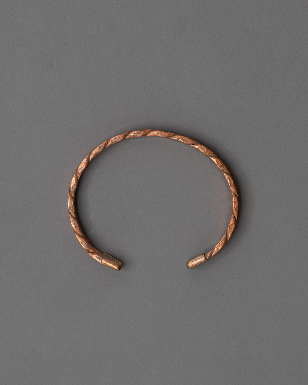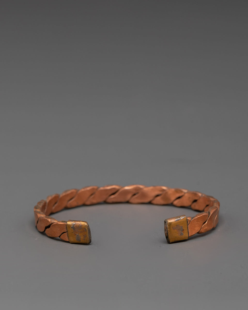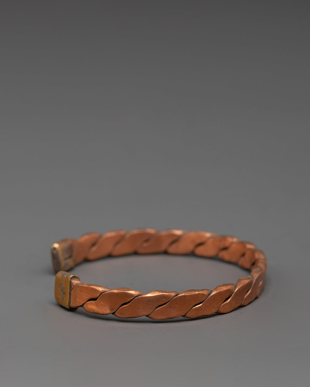 The intricate twisted design showcases expert craftsmanship, emphasizing the natural reddish hue of copper. This bracelet not only serves as a fashion statement but is also inspired by the historical and cultural significance of copper in promoting balance and positive energy. The minimalist yet bold design makes it ideal for layering with other bracelets or wearing solo to highlight its unique texture.
