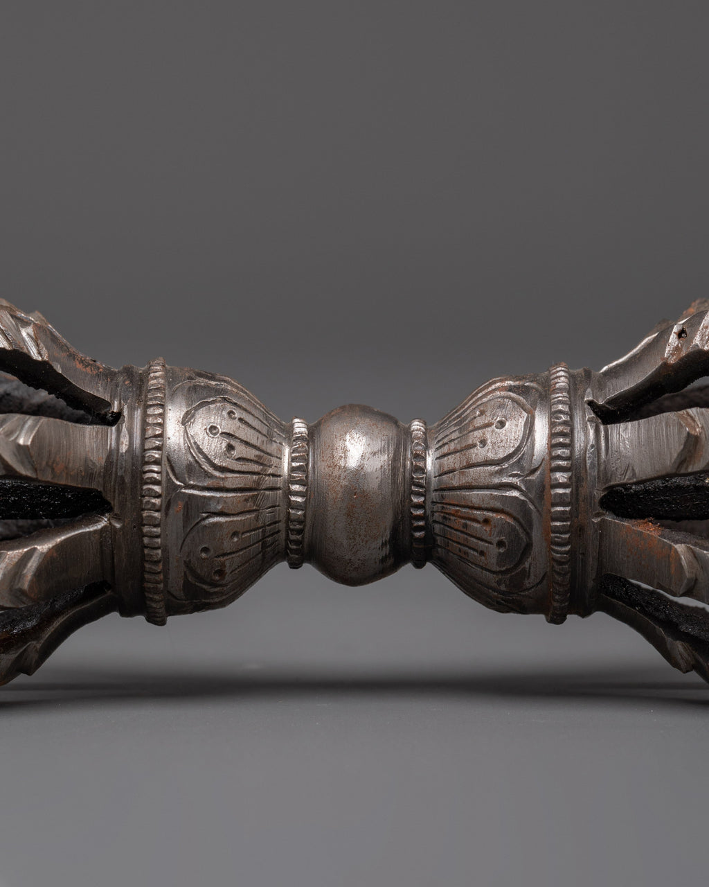 The design of this Vajra features intricate patterns that are deeply rooted in Buddhist symbolism. The iron material lends it both strength and gravity, creating an aesthetic balance between the spiritual and physical realms. The sharp points on both ends symbolize the cutting through of obstacles, while the central sphere represents wisdom and the interconnectedness of all beings. Each finely executed detail of the Vajra emphasizes its deep spiritual significance.
