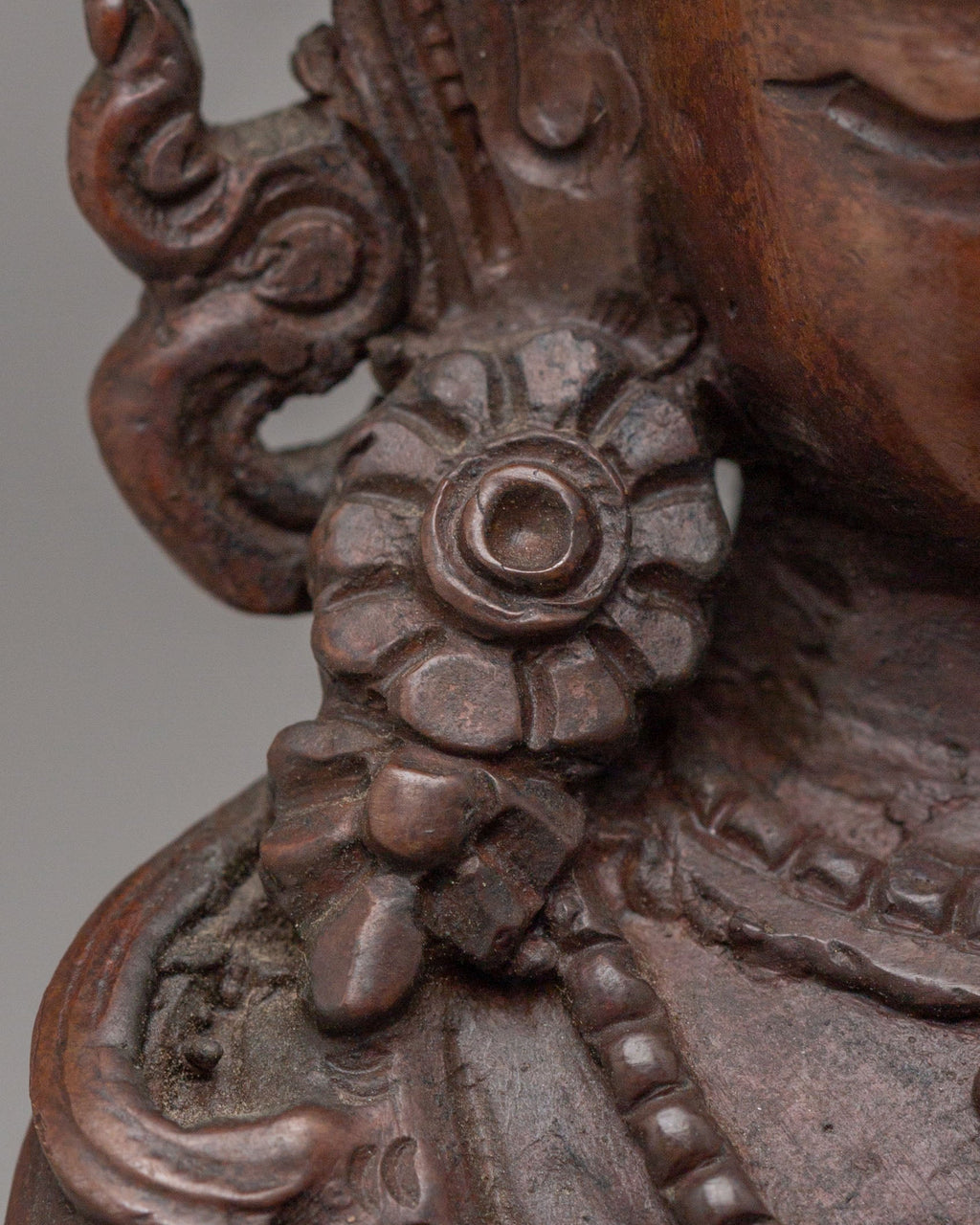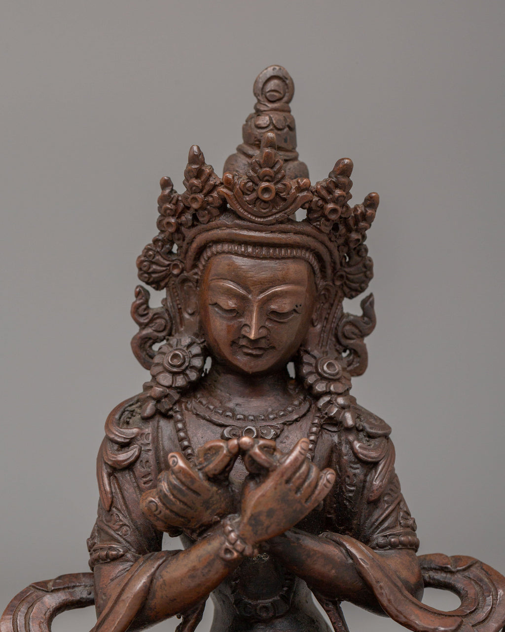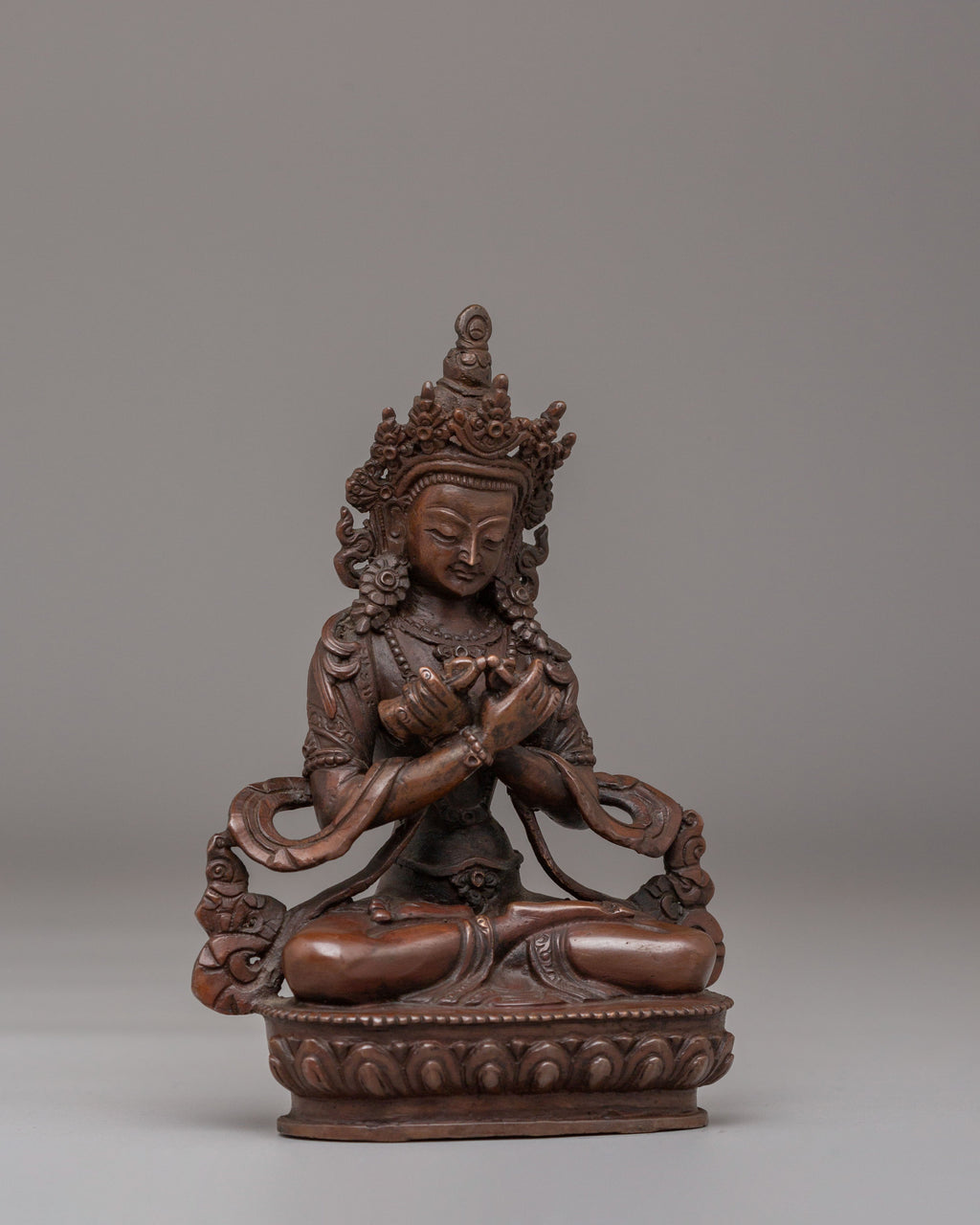 In this statue, Vajradhara is depicted seated in padmasana (lotus posture), embodying perfect meditative balance and enlightened presence. His right hand holds a bell, symbolizing wisdom and the feminine principle, while his left hand grasps a vajra, representing compassion and the masculine principle—together signifying the inseparable union of wisdom and method. He wears a five-pointed crown topped with a swirling sacred jewel, symbolizing the Five Dhyani Buddhas and enlightened qualities. Positioned atop a lotus base, the statue also features a vajra atop his head, underscoring his role as the primordial Buddha embodying the essence of Vajrayana teachings.