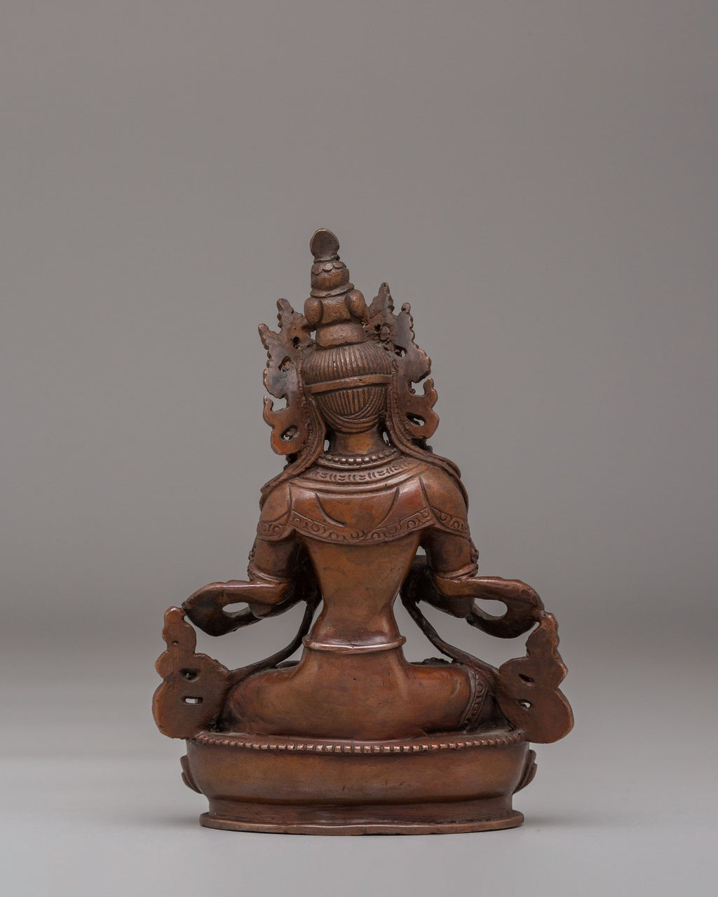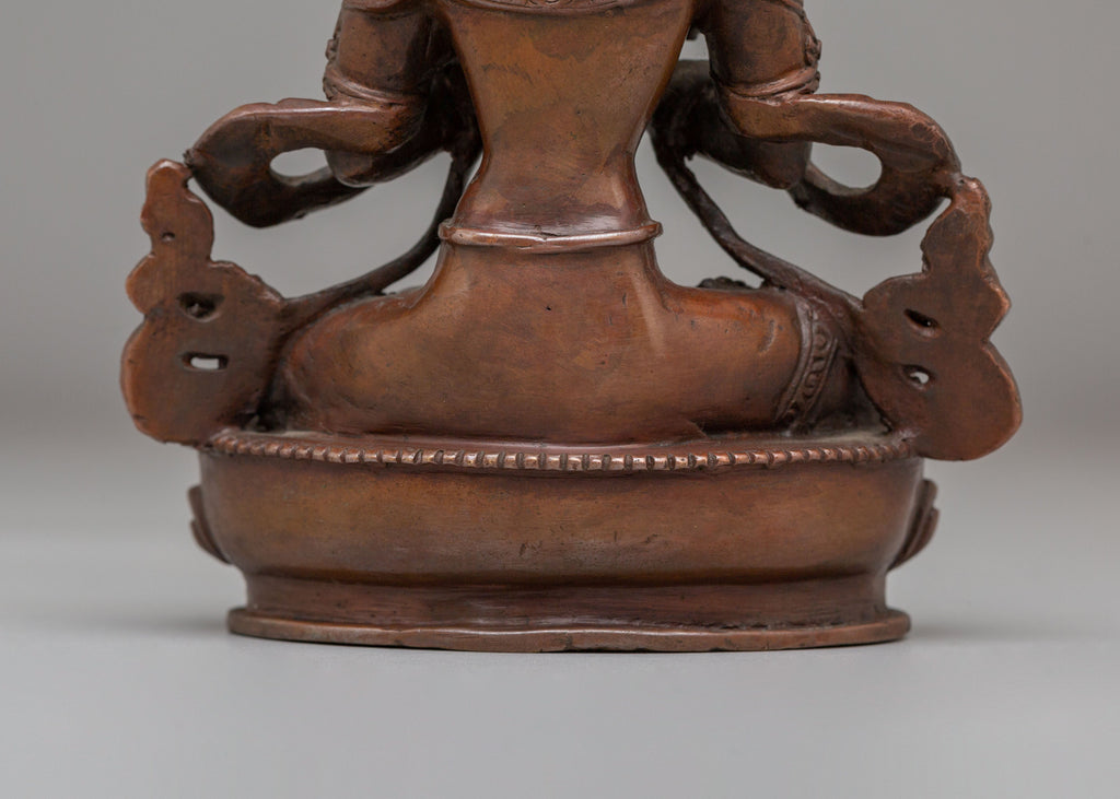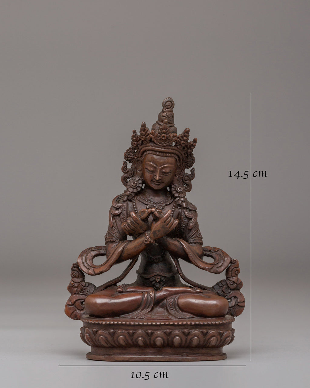 This Handmade Vajradhara Statue is a powerful representation of the primordial Buddha, embodying ultimate wisdom and enlightenment. Crafted from oxidized copper, this statue measures 14.5 cm in height and 10.5 cm in width, weighing 0.62 kg. Its intricate design captures the essence of Vajradhara's divine presence, making it an ideal addition to any spiritual space.