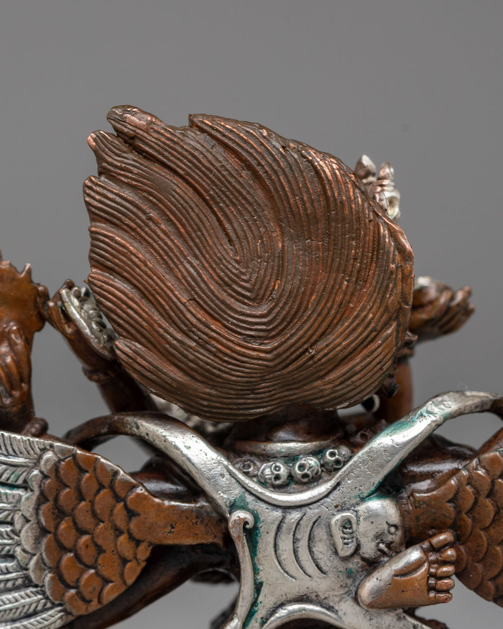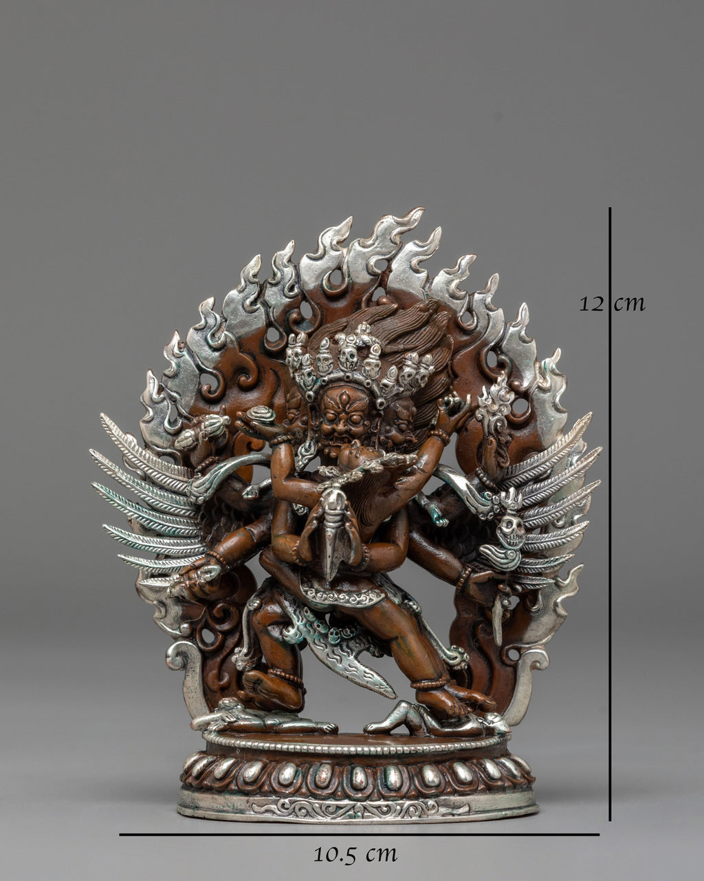 This statue depicts Vajrakilaya in his famous form, wielding a vajra (thunderbolt) and a bell, with numerous arms and a ferocious expression that represents his capacity to annihilate ignorance and suffering. The flame mandala behind him represents the removal of impediments and worldly distractions, freeing the practitioner to focus on the path of enlightenment. The rich workmanship on his crown, robes, and weaponry adds to the statue's spiritual importance, while the silver plating emphasizes Vajrakilaya's divinity, signifying his wisdom and strength.