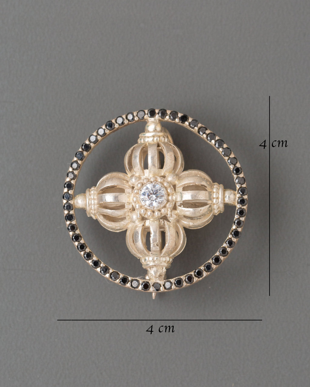 This exquisite Vishvavajra Brooch is a finely handcrafted piece made from 92.5% sterling silver, measuring 4cm in height and width, and weighing 0.018kg. Designed with meticulous attention to spiritual symbolism, it features the sacred double vajra (Vishvavajra)—a revered Buddhist emblem symbolizing stability, protection, and the indestructible nature of wisdom. The central jewel adds a radiant focal point, reflecting clarity and enlightenment, while the surrounding circle, adorned with delicate detailing, represents wholeness and unity.