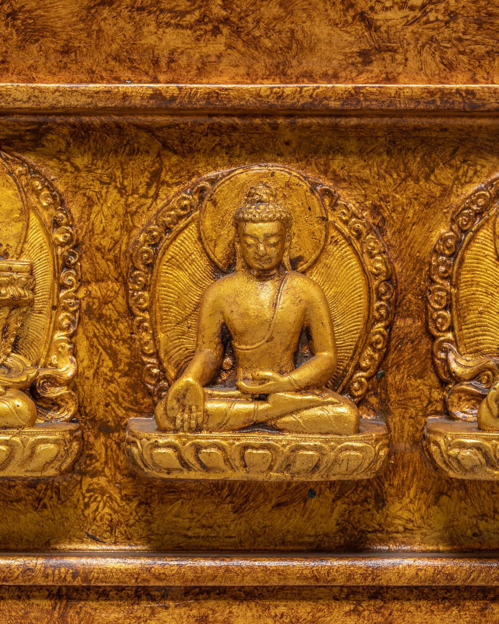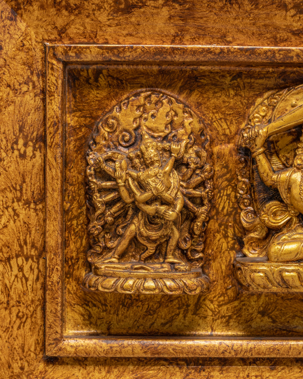 Crafted from stone dust with epoxy binding, this wall hanging stands as a testament to craftsmanship and spirituality. The materials give it both an elegant look and a lasting structure, combining durability with an earthy, natural texture that is perfect for any meditation space or room. The detailed motifs of each deity add not only aesthetic value but also spiritual significance, encouraging mindfulness and deep meditation. The backdrop is crafted from wood, adding a rustic touch that complements the celestial figures, making this piece an ideal fit for any home, temple, or sacred space.