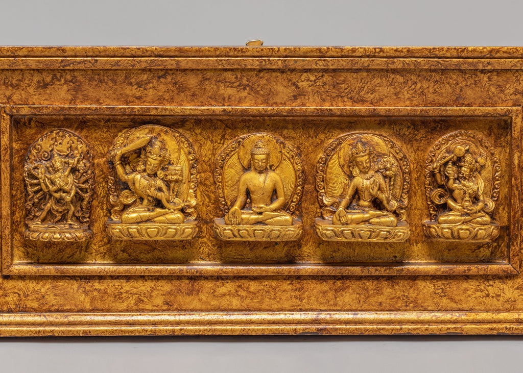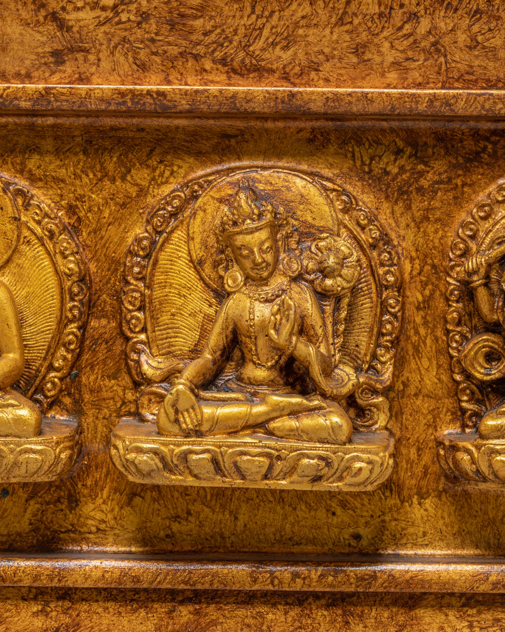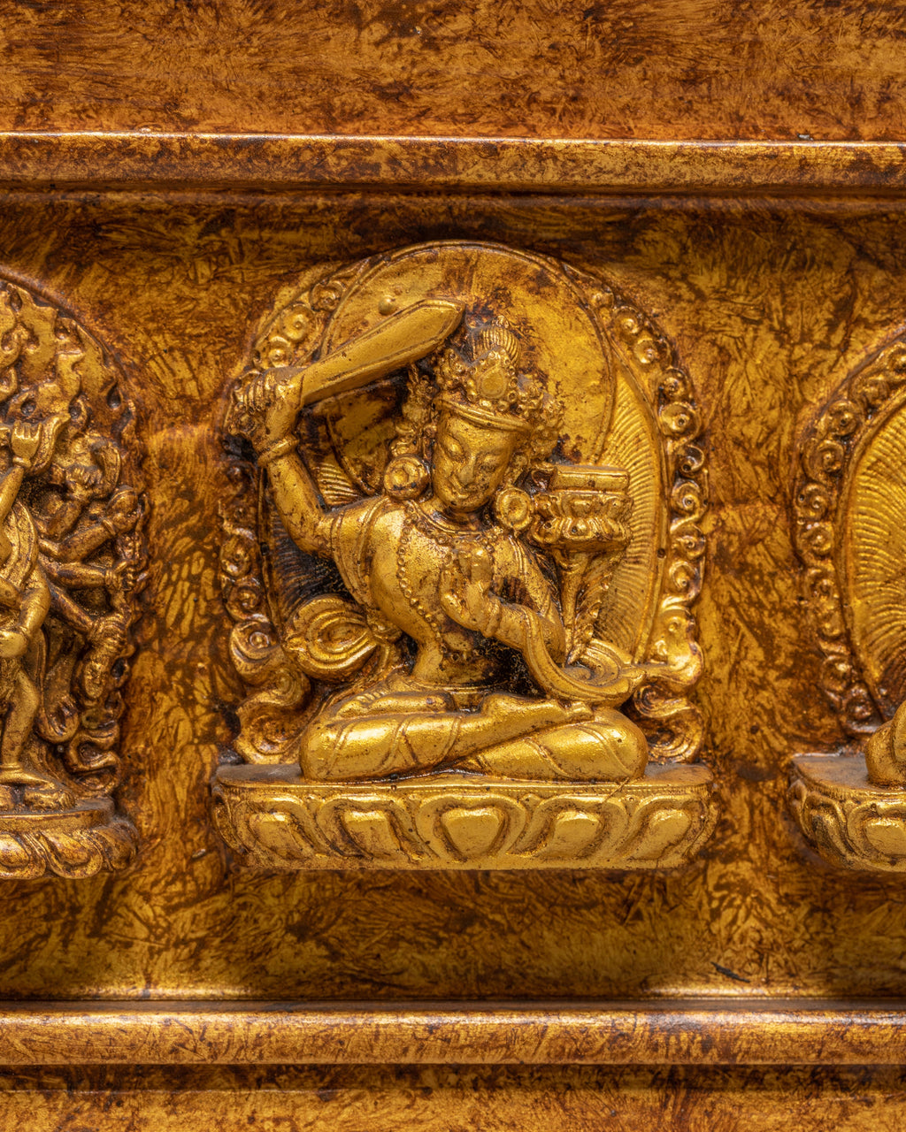 This Handmade Wall Hanging with Meditational Deities is an intricately designed piece of spiritual art that features five significant deities, each representing profound aspects of meditation, enlightenment, and divine protection. From right to left, the wall hanging includes Chakrasambhara, the fierce protector deity symbolizing the purification of negative energies, Manjushri, the bodhisattva of wisdom who embodies clarity and insight, and Ratnasambhara, the deity of wealth and prosperity who also represents the generous qualities of the universe. Tara, the goddess of compassion and healing, follows, offering grace and peace, and the final deity is a wrathful deity with consort, an influential figure representing the forceful protection of spiritual practice and the destruction of obstacles.