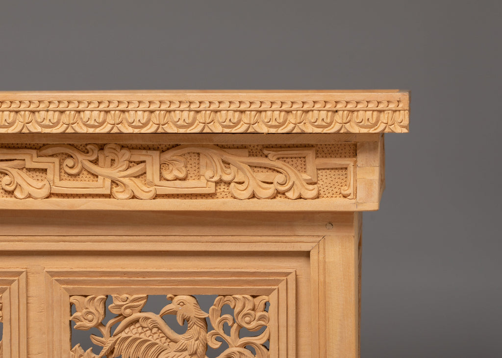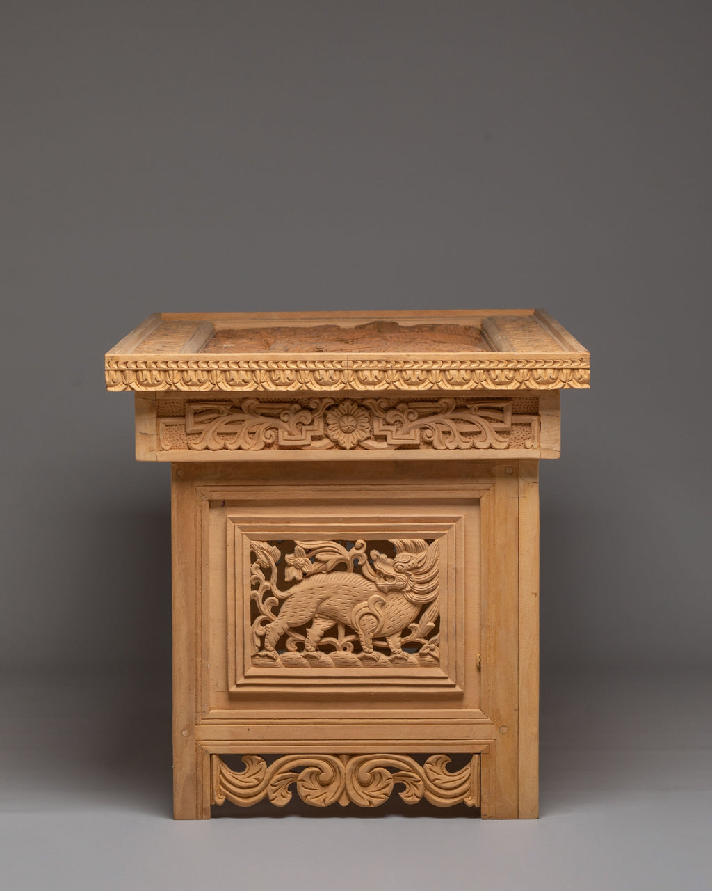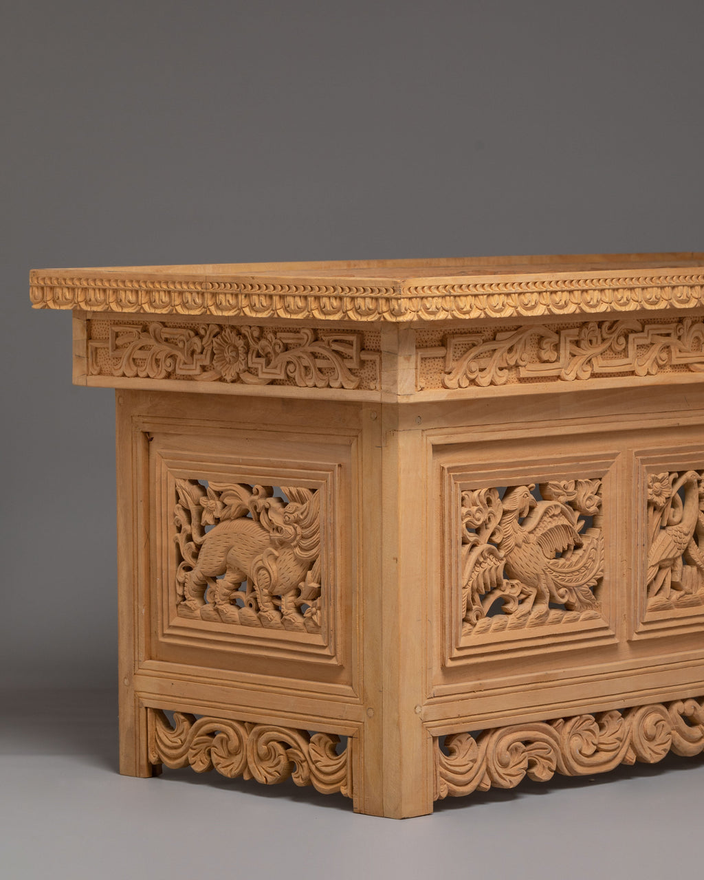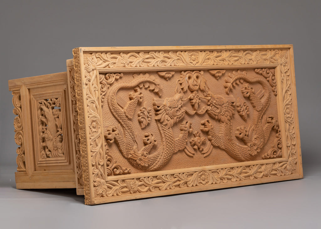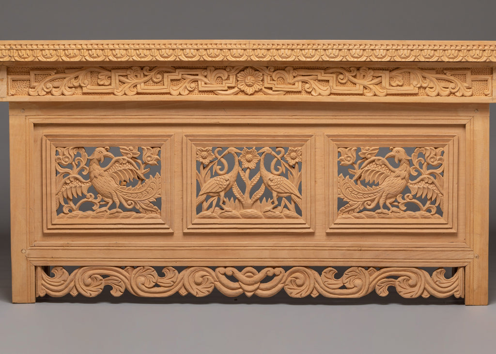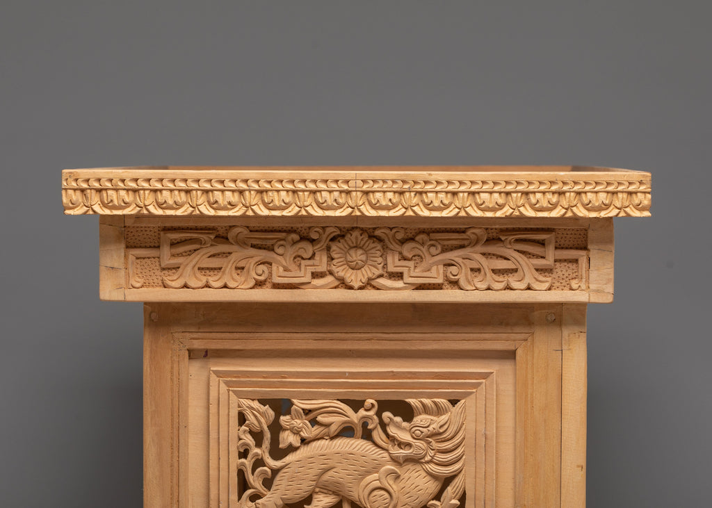 The front carving on this table shows two traditional dragons facing each other, carved in a balanced and symmetrical way. In Tibetan and Himalayan art, dragons symbolize power, protection, wisdom, and good fortune. The Front facing position represents balance, harmony, and unity, guarding the space where the table is used. Between them are floral and leaf motifs, which stand for purity, growth, and positive energy. The surrounding carved borders act as a protective frame, meaning safety and completeness. Overall, the iconography reflects strength, spiritual protection, and calm energy, making the table ideal for meditation, prayer, or peaceful home use.