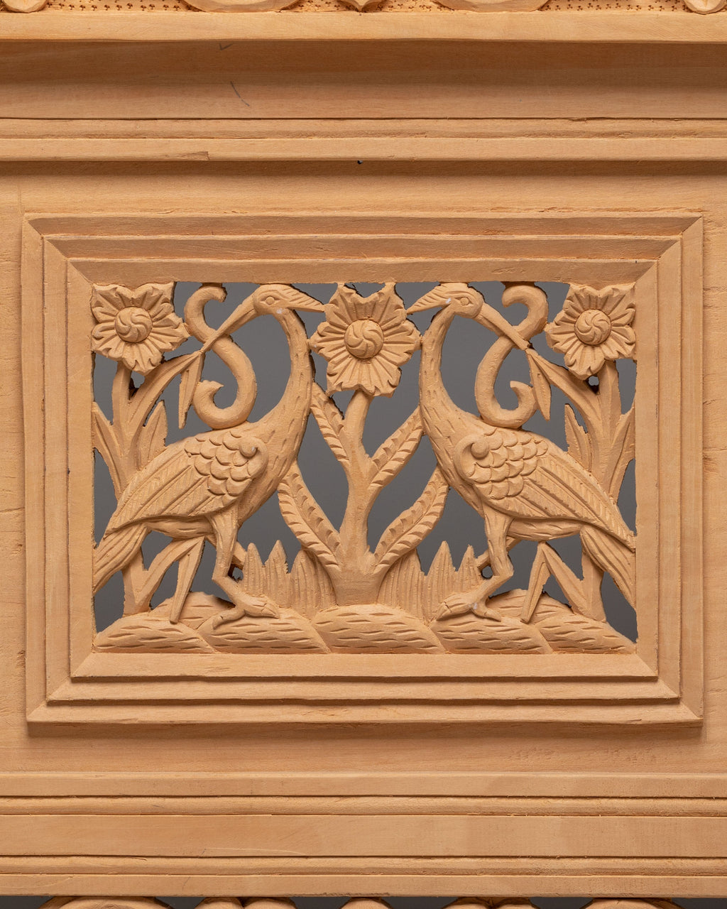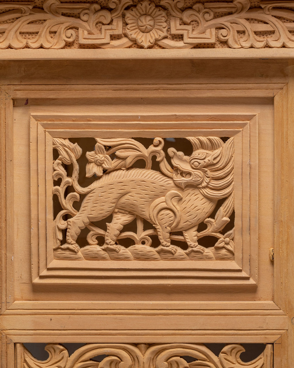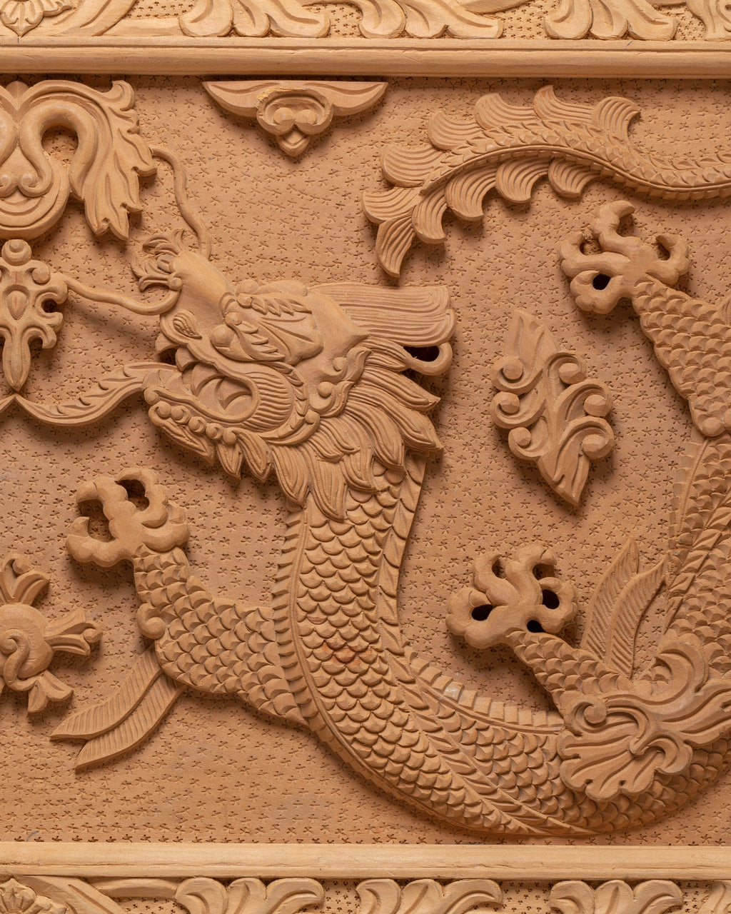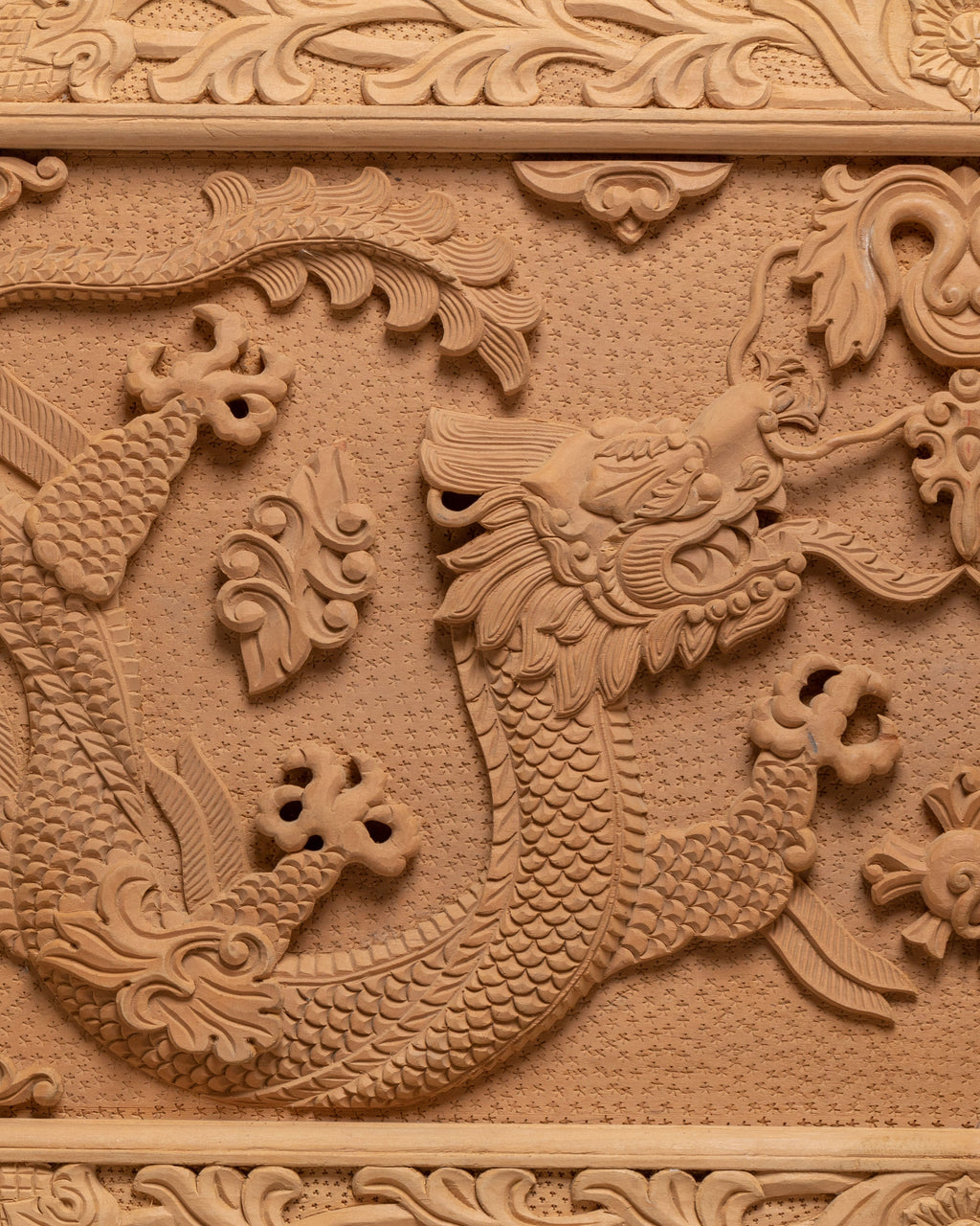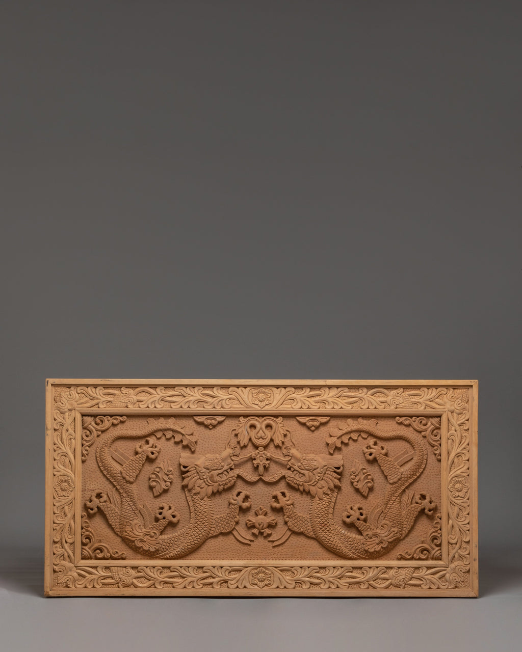 The front carving on this table shows two traditional dragons facing each other, carved in a balanced and symmetrical way. In Tibetan and Himalayan art, dragons symbolize power, protection, wisdom, and good fortune. The Front facing position represents balance, harmony, and unity, guarding the space where the table is used. Between them are floral and leaf motifs, which stand for purity, growth, and positive energy. The surrounding carved borders act as a protective frame, meaning safety and completeness. Overall, the iconography reflects strength, spiritual protection, and calm energy, making the table ideal for meditation, prayer, or peaceful home use.