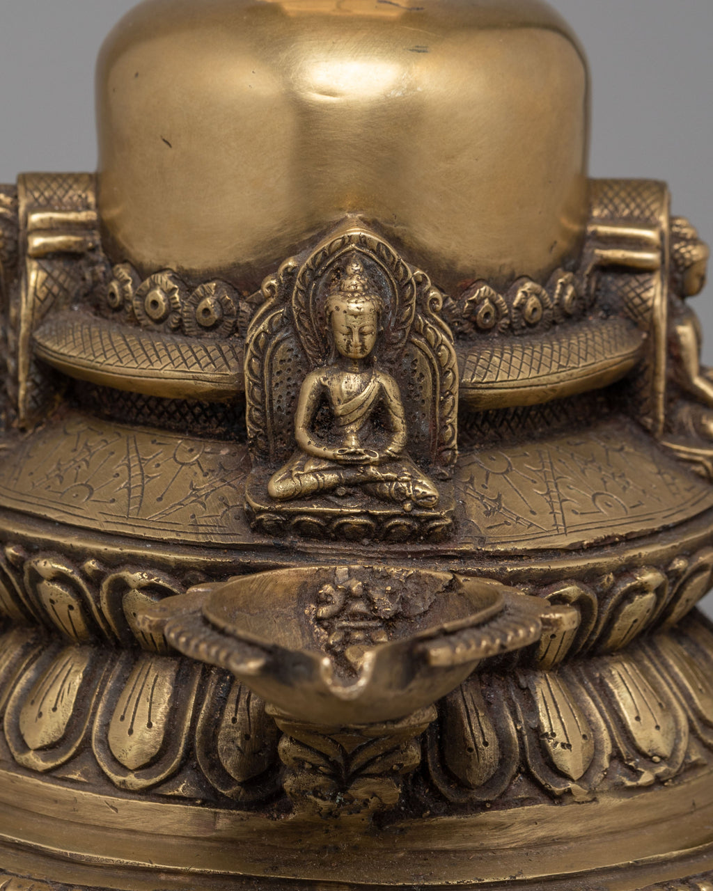 At the center of this Hanging Stupa Dalucha sits Amitabha Buddha, depicted in a serene meditative posture. The top of the stupa is crowned with a more miniature stupa, symbolizing enlightenment. At the same time, the middle section features a double lotus base, representing purity, spiritual awakening, and the blossoming of wisdom. This thoughtful design merges sacred symbolism with aesthetic harmony, making it both a visual and spiritual focal point for ritual spaces.