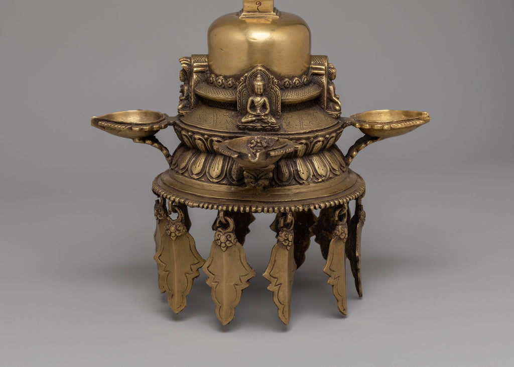 The Dalucha holds deep cultural and spiritual significance in Newar Buddhist and Hindu traditions, where lighting an oil lamp symbolizes offering light to deities and dispelling ignorance. Traditionally hung in temples, shrines, and monasteries, it is a sacred vessel for illumination during rituals and prayers. The intricate craftsmanship, often featuring oxidized copper or brass with ornate embellishments, showcases Nepalese metalwork's devotion and artistic excellence. Beyond its religious use, the Dalucha enhances the ambiance of meditation spaces, bringing a sense of serenity, reverence, and spiritual connection.