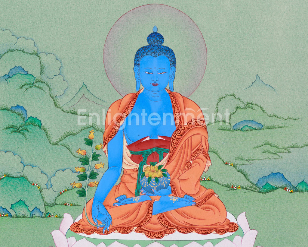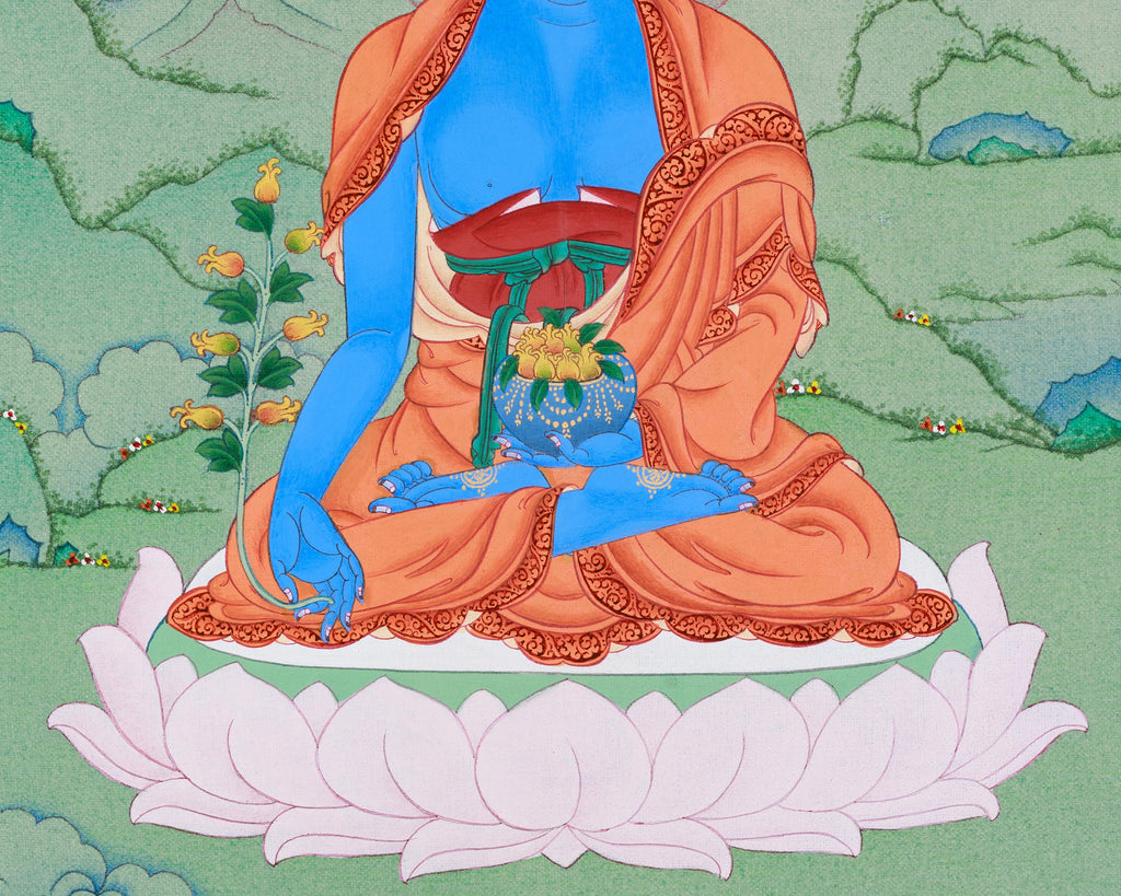 Bhaisajyaguru, also known as the Healing Buddha, is a key figure in Mahayana Buddhism. Recognised as the Buddha of Medicine, he is believed to possess the power to heal both physical and spiritual illnesses. His compassionate vow to ease suffering and guide beings to enlightenment makes him vital for those seeking healing. In this thangka, Bhaisajyaguru has a lapis lazuli-blue body, symbolizing his healing power and purity. His monk's robe indicates his renunciation of worldly desires, while the myrobalan plant represents medicinal herbs, illustrating his healing abilities. In this thangka, Bhaisajyaguru is shown seated on a lotus seat, his left hand holding a bowl of myrobalan fruit, which is known for its healing properties. His posture is serene, symbolizing his deep meditative state and readiness to assist all beings in need. The moon above him symbolizes his transcendence and purity. Invite the healing energy of Bhaisajyaguru into your space and experience the transformation it brings.