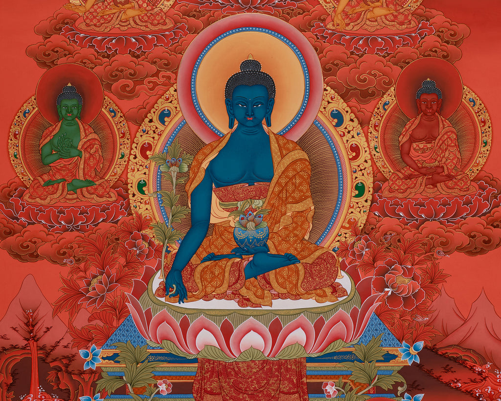 The Healing Buddha with Dhyani Buddhas Thangka, which has been expertly painted, a representation of cosmic harmony, knowledge, and compassion. His deep blue color represents the ultimate remedy for pain, and his visual shape and chant are used in rituals to cure illness, cleanse karma, and eradicate mental and spiritual sadness. With a myrobalan plant and a bowl of nectar, representing both spiritual and physical healing. The deep blue Medicine Buddha, Bhaisajyaguru, at its core, exudes calm authority and limitless healing energy. The artwork is meticulously painted on cotton canvas in the traditional Tibetan style, employing genuine 24K gold and acrylic colors to enhance its beauty and spiritual significance.