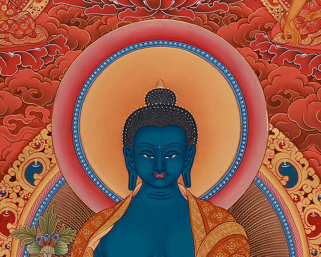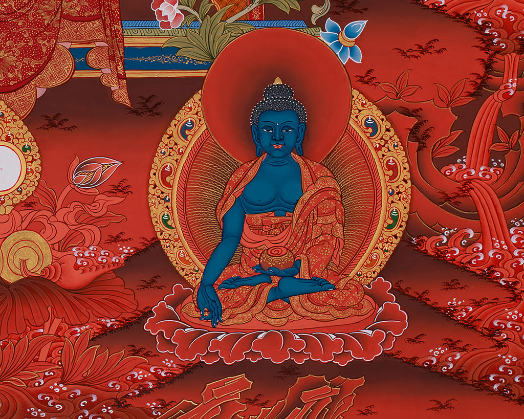 Encircled by radiant light, his serene posture and empathetic expression embody his role in healing all beings. Spiritual presence is further enhanced by the halo behind his head, which highlights it's heavenly nature. His depiction is embellished with a monk's traditional robe, which is elaborately crafted to symbolize the sacredness of his appearance. He is surrounded by the Five Dhyani Buddhas, each of whom represents a distinct enlightened characteristic and guiding wisdom: Vairocana, Akshobhya, Ratnasambhava, Amitabha, and Amoghasiddhi. They combine to create a sacred pattern of transformational power, which makes this thangka a powerful visual meditation on balance, health, and cleansing.