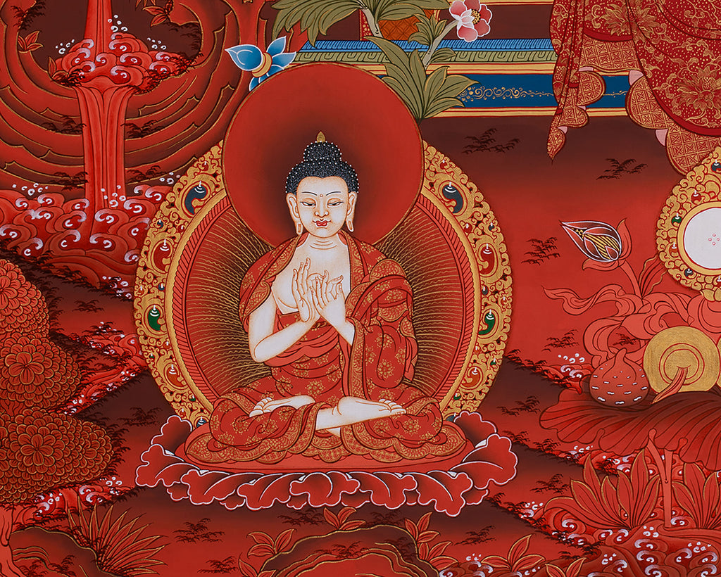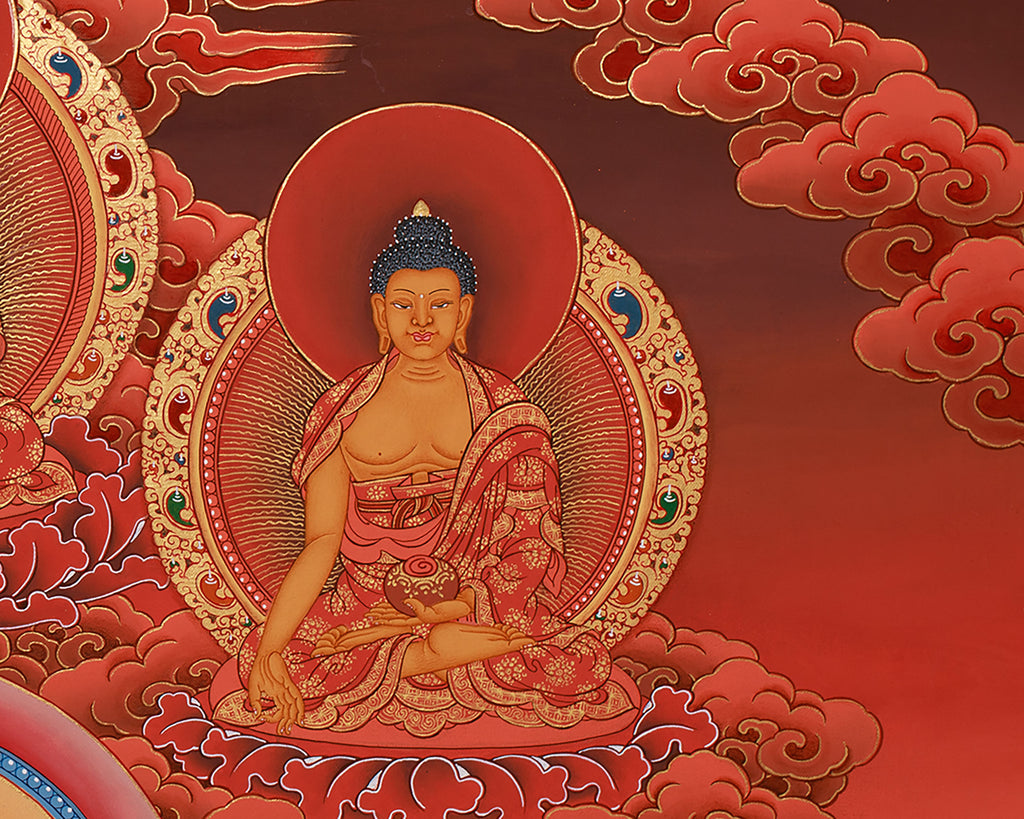 The flaming red background, which in Vajrayana imagery generally symbolizes life energy and divine transformation, adds intensity and symbolic vibrancy. Devotion and skill have gone into every detail, from the elaborate lotus pedestal to the whirling clouds and floral accents. The distant mountains reflect the stability and durability of the Buddha's teachings, while the rivers that flow across the landscape signify the never-ending flow of wisdom and compassion. The Dhyani Buddhas' harmonious symmetry heightens the composition's mandalic intensity, producing a work of religious development as well as art. This thangka serves as a visual invocation of harmony and wellness throughout body, speech, and mind, making it perfect for healing environments, meditation rooms, or spiritual shrines.