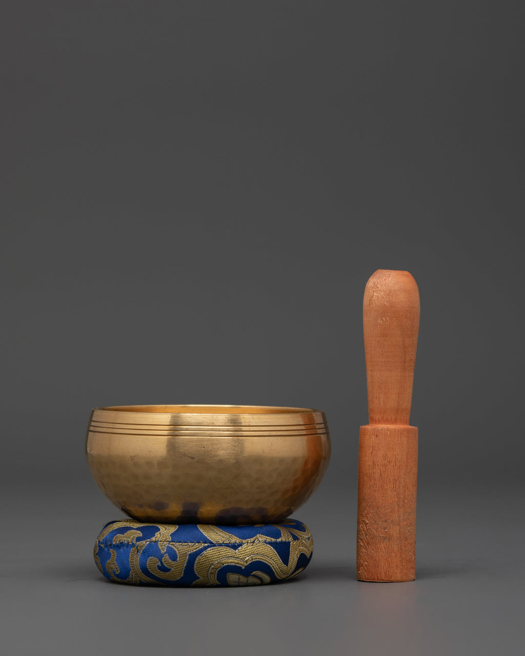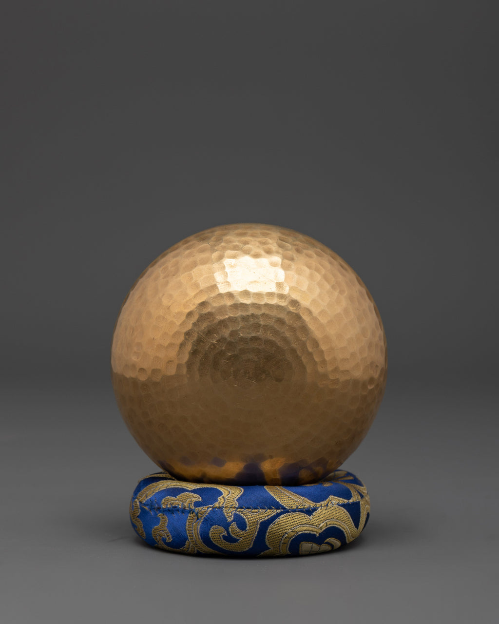 This singing bowl, made of a sacred blend of five metals—embodies the spirit of Tibetan philosophy's five elements. The accompanying hardwood striker and cushioned base increase resonance, resulting in smooth vibration and balanced tone when played. Each sound wave produced relieves stress, aligns energy flow, and promotes attention. The bowl's golden surface reflects the artistry of Himalayan craftsmanship, making it both a meditation tool and a spiritual decoration.