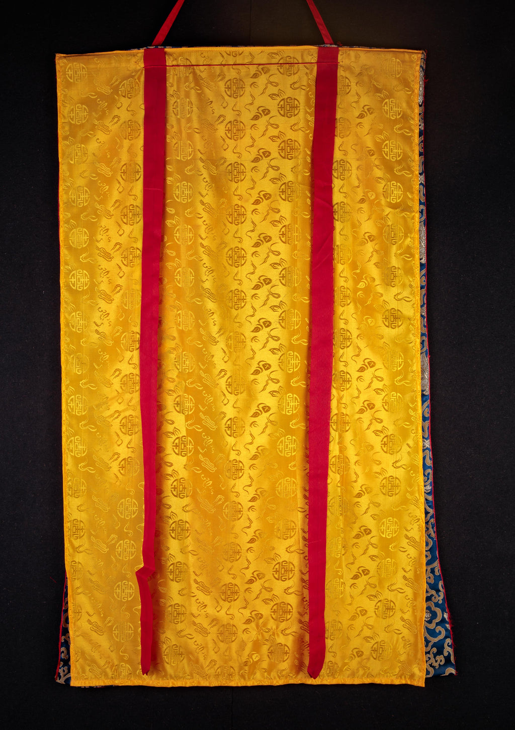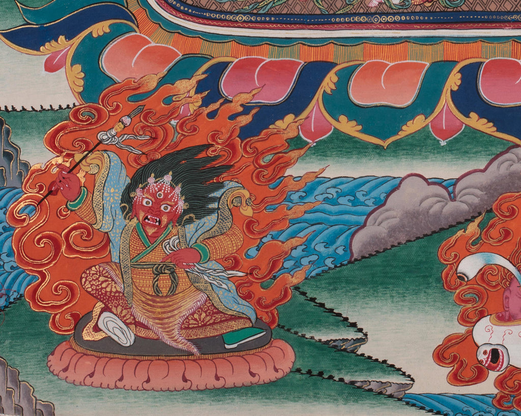 Heruka Yamantaka Thangka is an iconic example of Tibetan religious art, created on cotton canvas with gold accents. With its exquisite red-and-blue silk brocade frame, the artwork exudes dedication and heritage. In Tibetan Buddhism, Yamantaka, a wrathful manifestation of Manjushri, is worshipped as a conqueror over death and the personification of supreme protection and wisdom.
