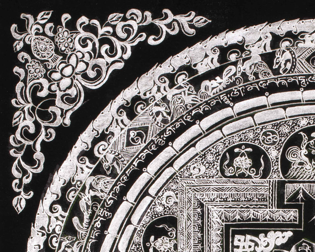 At the heart of this mandala is a symbolic flower that signifies purity and spiritual awakening. Encircling it are sacred mantras, “Om Mani Padme Hum,” arranged in a circular pattern around the central motif. These mantras, revered for their profound spiritual significance in Tibetan Buddhism, extend outward, symbolizing the dissemination of compassion and wisdom. The silver accents enhance the sacred geometry, boosting the energy of the mantras and inviting peace, clarity, and enlightenment. This thangka serves as both an attractive decorative piece and a potent spiritual aid for meditation, reminding us of the journey toward balance and harmony.