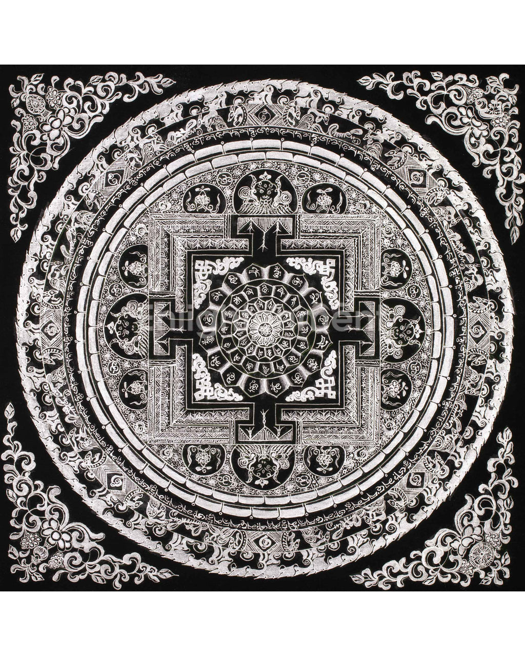 A stunning example of Tibetan Buddhist art, this high-quality mantra mandala is carefully hand-painted on fine cotton canvas. Created from pure silver and acrylic colors, the piece embodies traditional workmanship passed down through generations of Nepali artisans. The pure silver accents highlight the intricate details of the mandala, adding depth and radiance to its geometric symmetry. The combination of silver and vibrant acrylics makes the design both visually striking and spiritually meaningful, offering a unique fusion of artistry and devotion.
