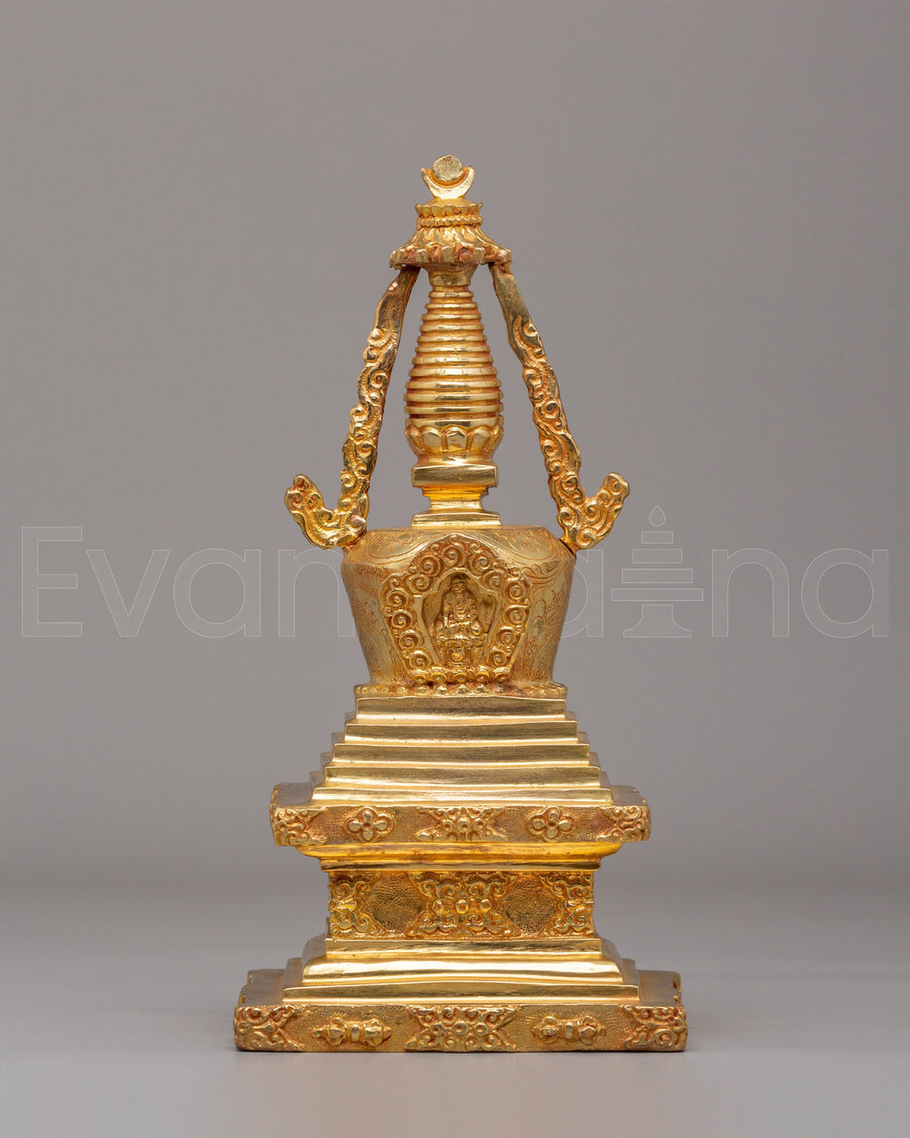 In Buddhist tradition, a stupa represents the path to enlightenment and the Buddha’s teachings. This particular stupa design embodies the sacred symbolism of Tibetan Buddhism, incorporating elements that symbolize the Buddha’s wisdom, protection, and the dispelling of ignorance. The combination of copper and gold plating not only gives it an elegant, sacred appearance but also enhances its spiritual properties, making it an excellent object for meditation, prayer, or simply reflecting on the deeper meaning of life.