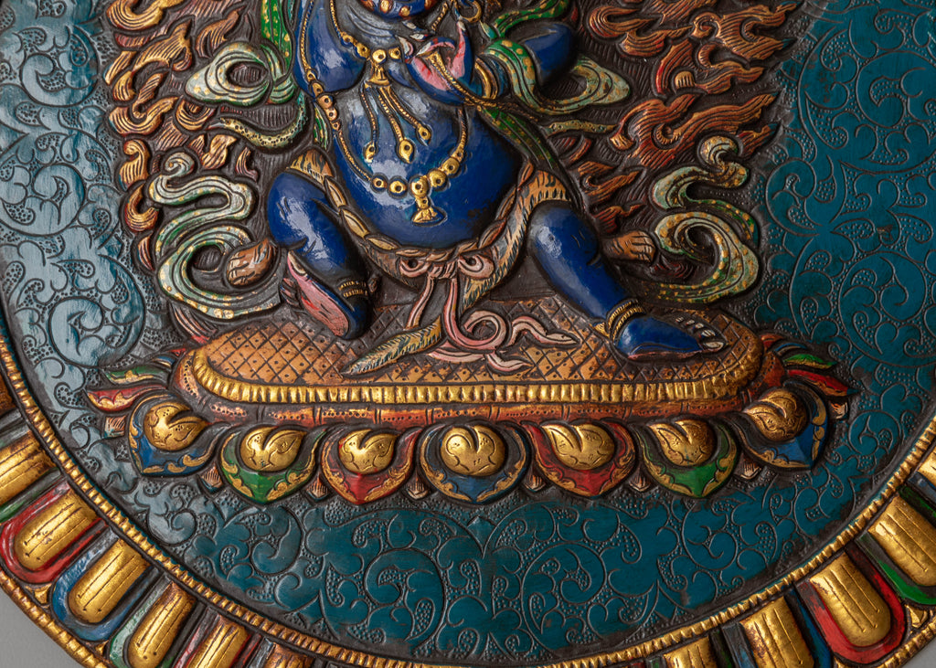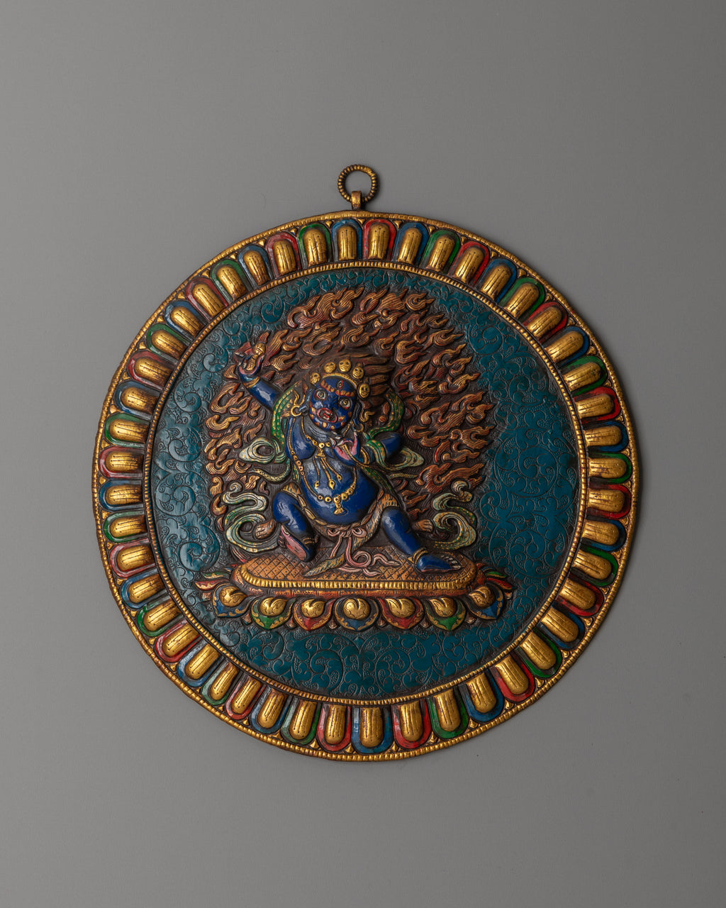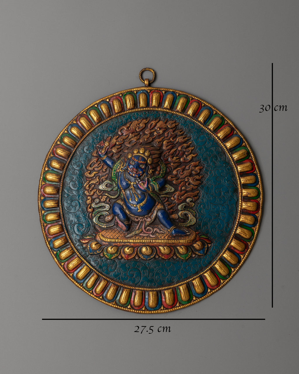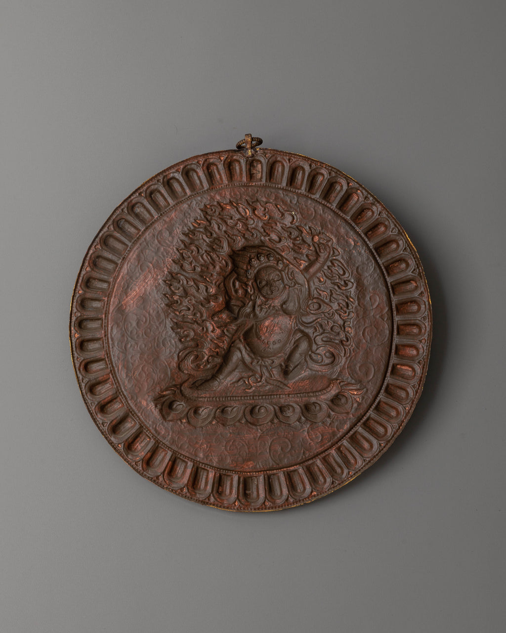 The wall hanging features Vajrapani, the powerful deity who embodies the Buddha’s strength and serves as a fierce protector, transforming negative energies into enlightened force. Surrounded by swirling flames and intricate ornamental motifs symbolizing purification, clarity, and spiritual power, Vajrapani’s dynamic presence is enhanced by vibrant acrylic colorwork, each hue reflecting qualities such as wisdom, compassion, and courage. The copper body lends an antique character, connecting the piece to centuries-old Tibetan craftsmanship and deep spiritual symbolism.