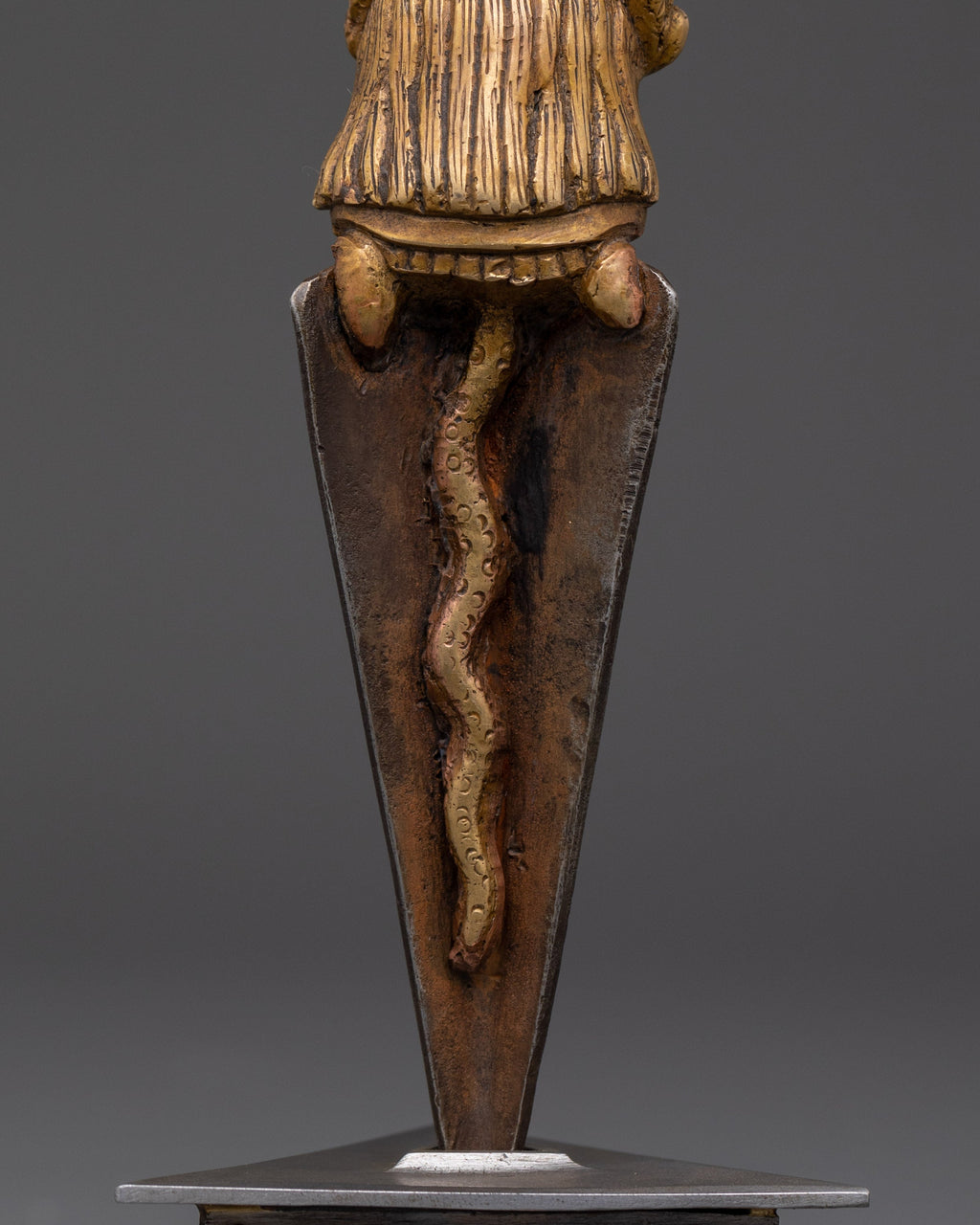 The ceremonial dagger (Sanskrit: Kila; Tibetan: phurba) is essential for expelling evil and is considered particularly effective in neutralizing the forces obstructing Tantric Buddhist practice. It has ancient origins, first appearing in the Indian Rig Veda as the core blade of the vajra used by Indra to destroy the primordial cosmic snake Vritra. Kila, derived from Sanskrit, was most likely associated with Vedic sacrifices. Meditation on the Vajrakila Tantra, an early Indian scripture first promoted in Tibet in the eighth century by Padmasambhava, one of the founding teachers of Tibetan Buddhism, is used to invoke the three-headed Vajrakila Buddha.