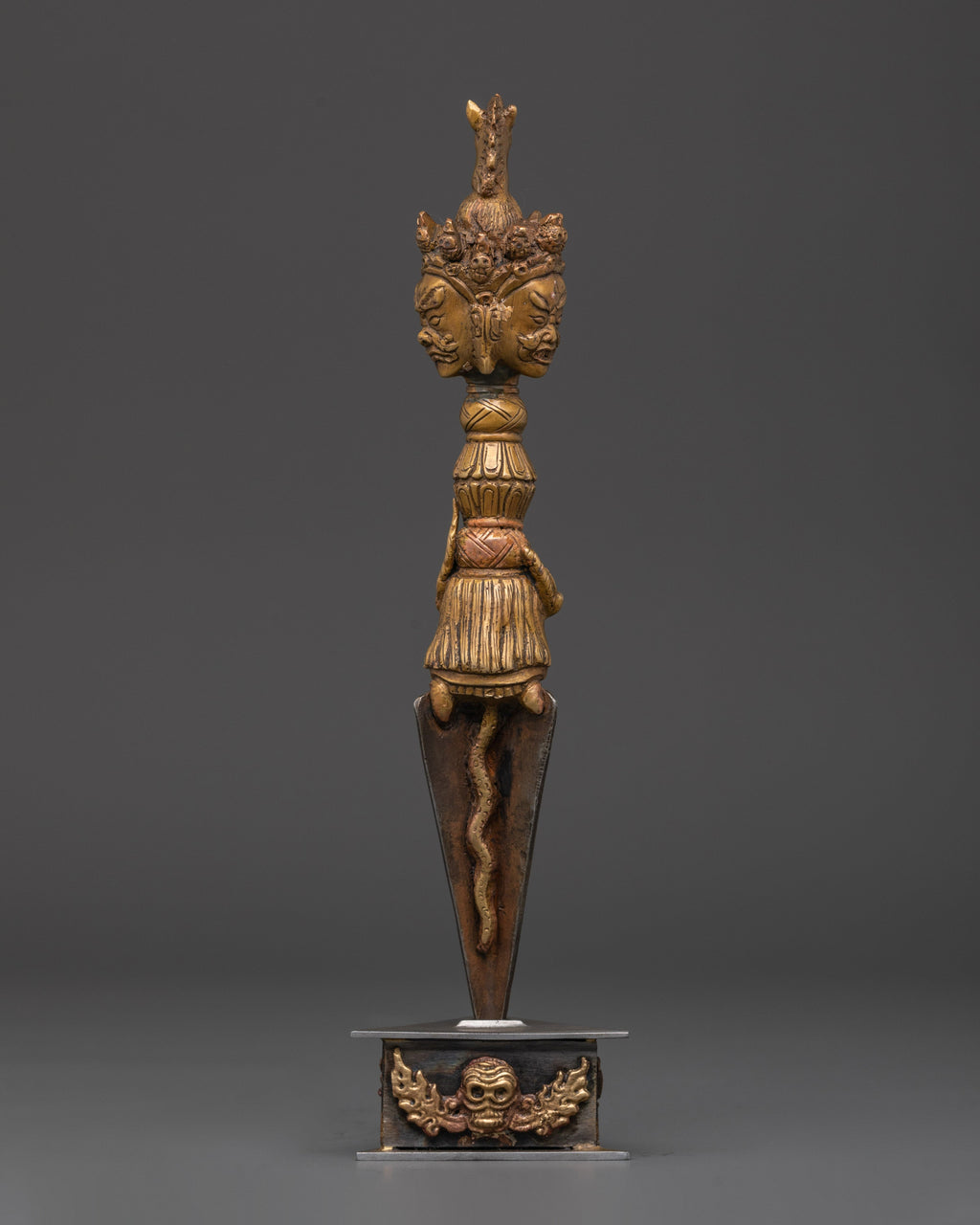 Crafted from bronze, this Himalayan Phurba balances both artistry and spiritual function. Weighing 0.58 kg, it offers a solid, authentic feel that enhances its use in rituals. The Phurba’s three-sided blade represents the overcoming of the three poisons: ignorance, attachment, and aversion, making it an essential artifact for deepening mindfulness and spiritual growth. Whether displayed as a sacred object or used in personal practice, this Phurba carries profound cultural and energetic significance.