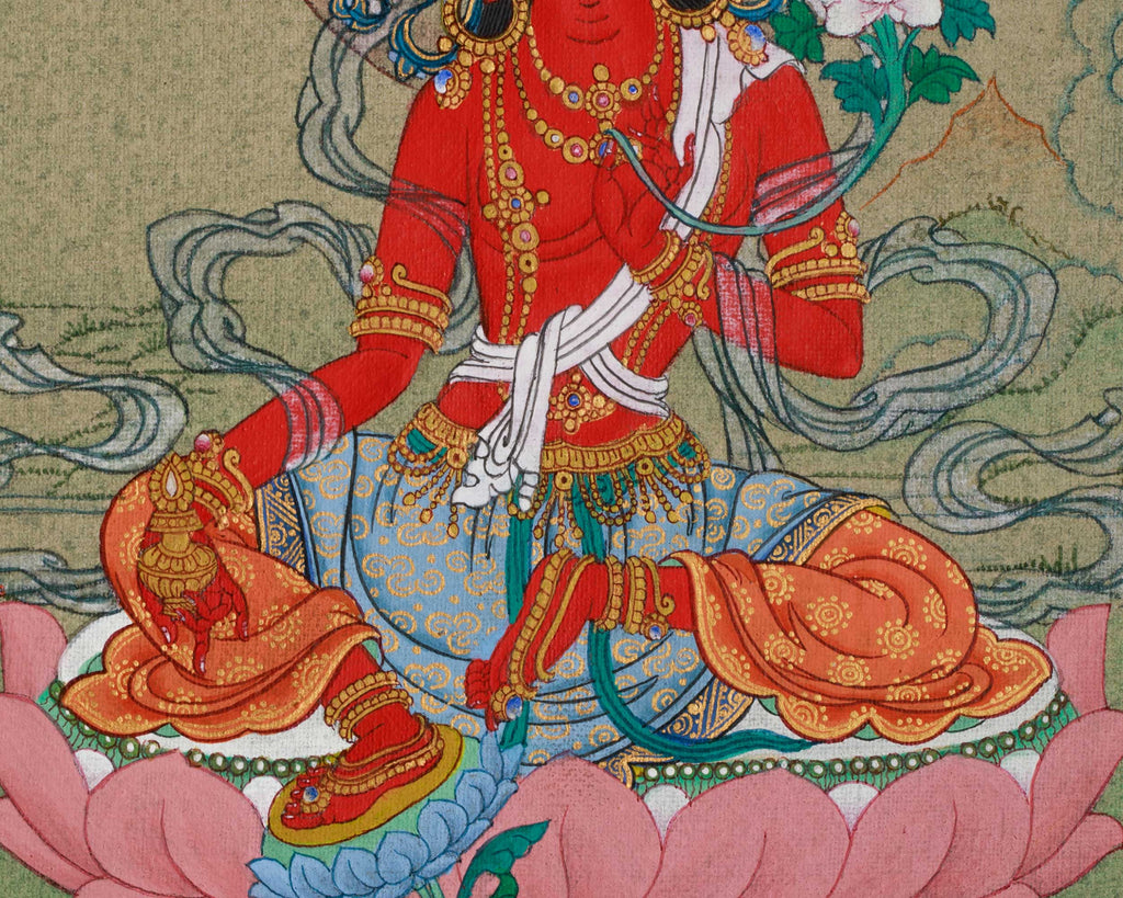 Red Tara is known for dispelling negative energies, offering courage, and supporting spiritual advancement. She is invoked to remove worldly and spiritual obstacles and to cultivate enlightenment. She is known as Raktatara. She is a manifestation of the goddess Tara. Depicted in a regal ease posture, with a nectar vase and a bow and arrow, her vibrant red symbolizes energy and transformation. Surrounded by a lotus and a potent aura, this detailed thangka highlights Tara's presence and aids in overcoming challenges. As a principal Vajrayana deity, she exemplifies active compassion, quickly assisting those in need. Widely recognized as the "Giver of Fearlessness," she exudes a dynamic energy that provides protection and motivation, guiding us toward spiritual liberation. Red Tara, symbolizing magnetic power and enlightened action, manifests in her red form, emanating warmth, strength, and compassion.