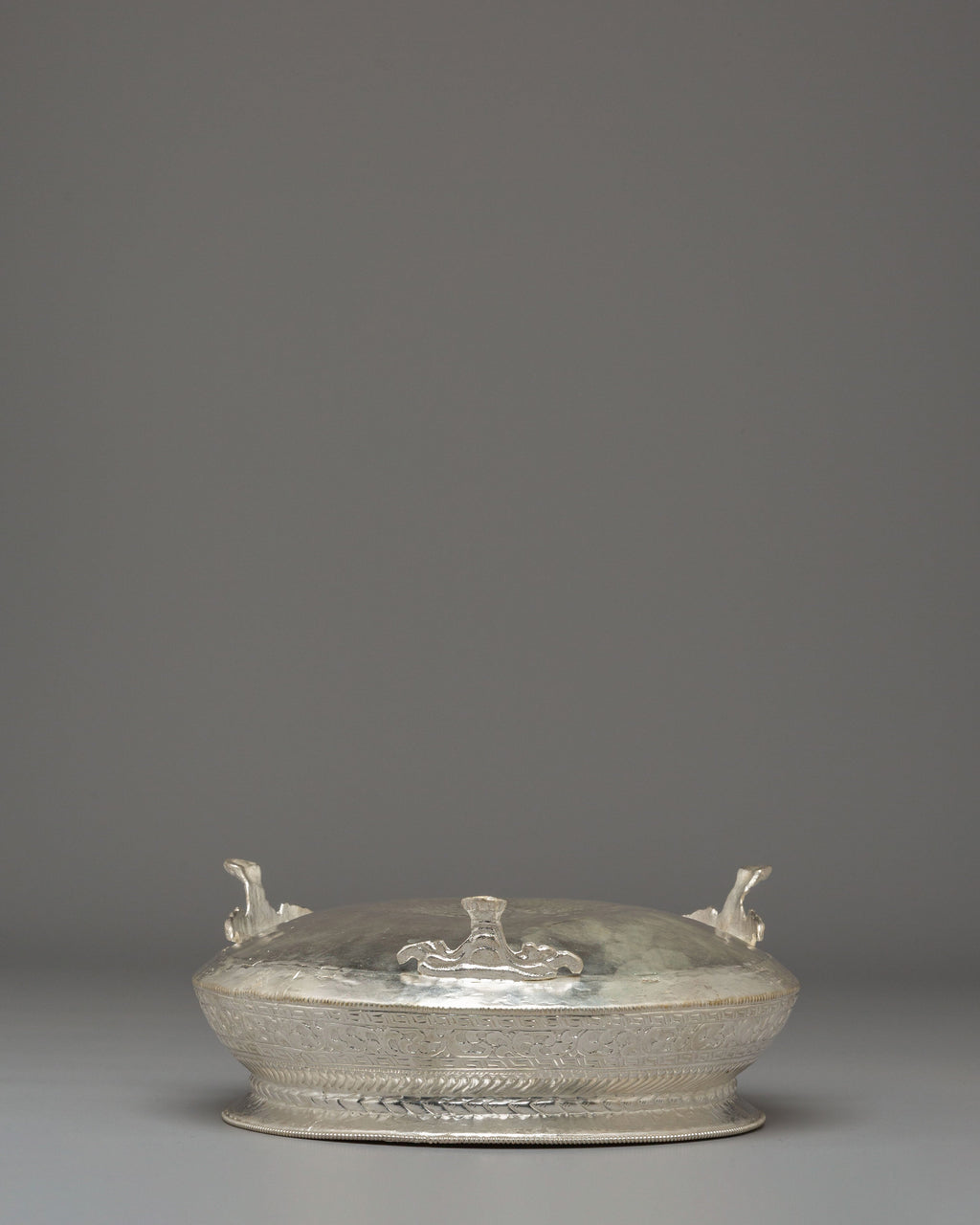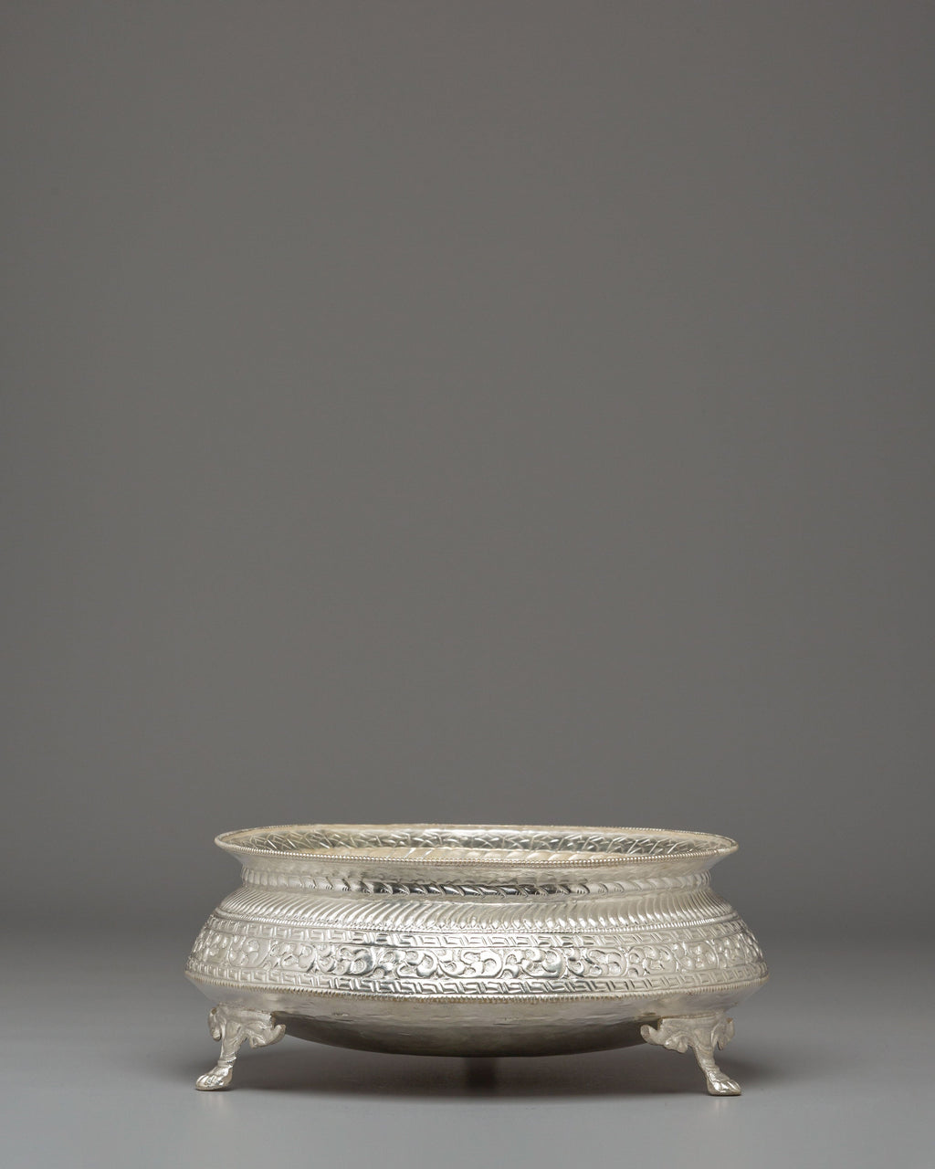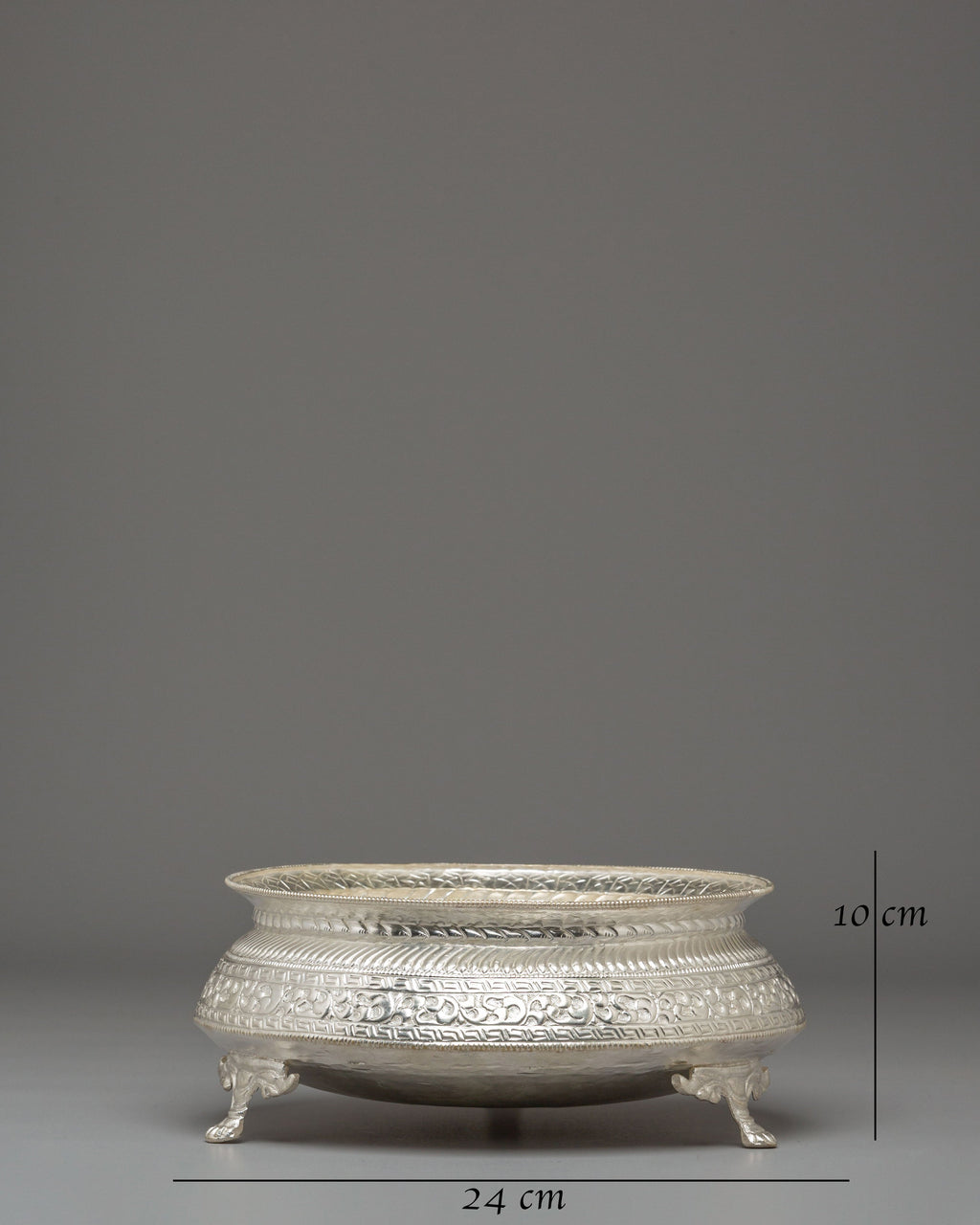 The Himalayan Ritual Khadkula is a sacred ceremonial vessel, deeply rooted in Buddhist tradition and Himalayan craftsmanship. Handcrafted from brass and elegantly silver-plated, this ritual bowl is used for spiritual offerings, symbolizing purity, abundance, and devotion. With its gently curved shape and raised feet, it represents balance and stability in practice. Its polished silver surface reflects light beautifully, creating an aura of serenity that enhances any altar or meditation space.