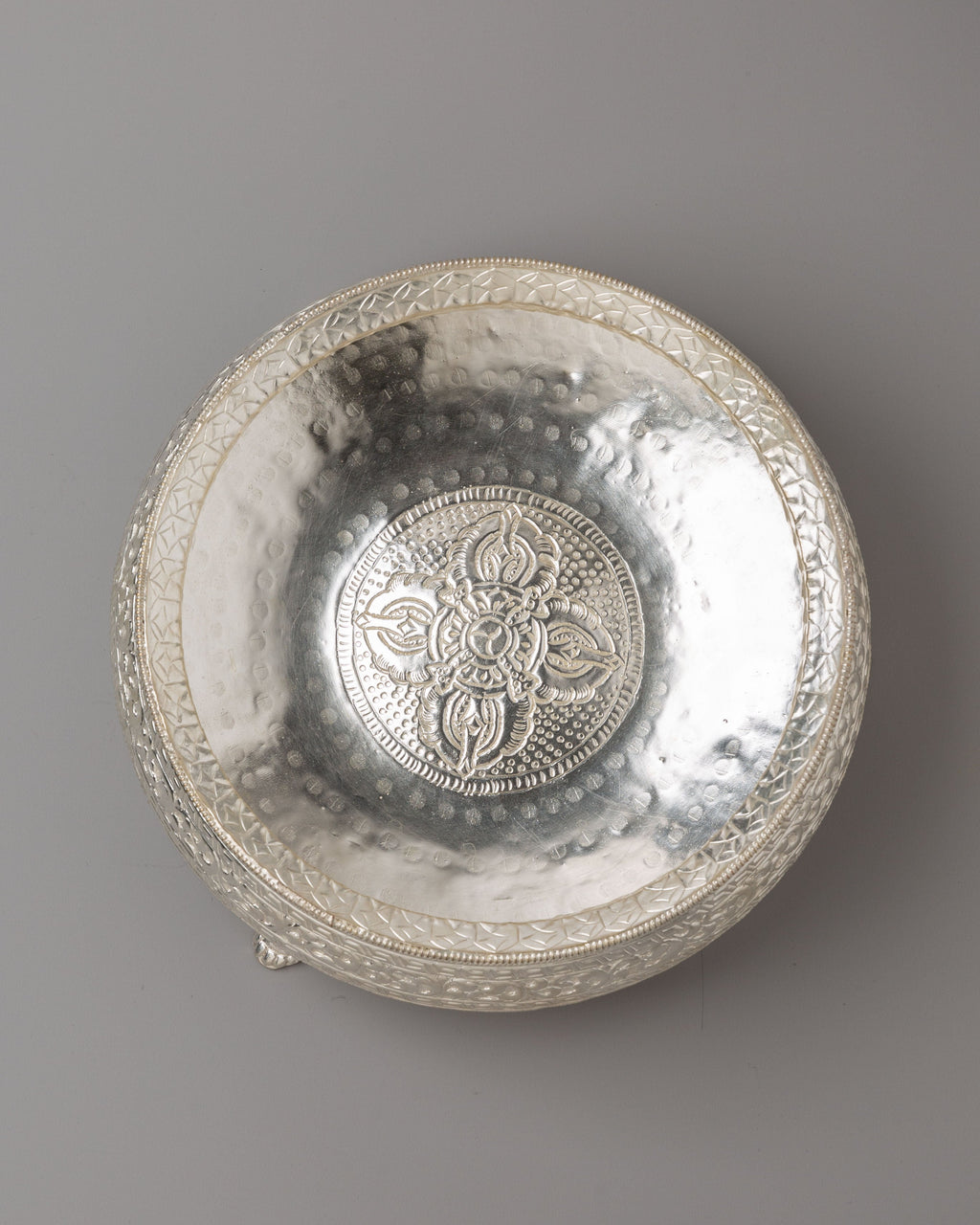 Adorned with intricate Tibetan-inspired patterns, the Khadkula bowl features embossed motifs that carry deep symbolic meaning. The fine details—seen in the engraved lotus and floral borders—reflect the artisan’s devotion to precision and spirituality. The lotus design, a common motif in Buddhist art, signifies enlightenment and the unfolding of inner peace. The raised circular medallion at the base embodies protection and completeness, connecting this sacred vessel to the spiritual essence of offering rituals.