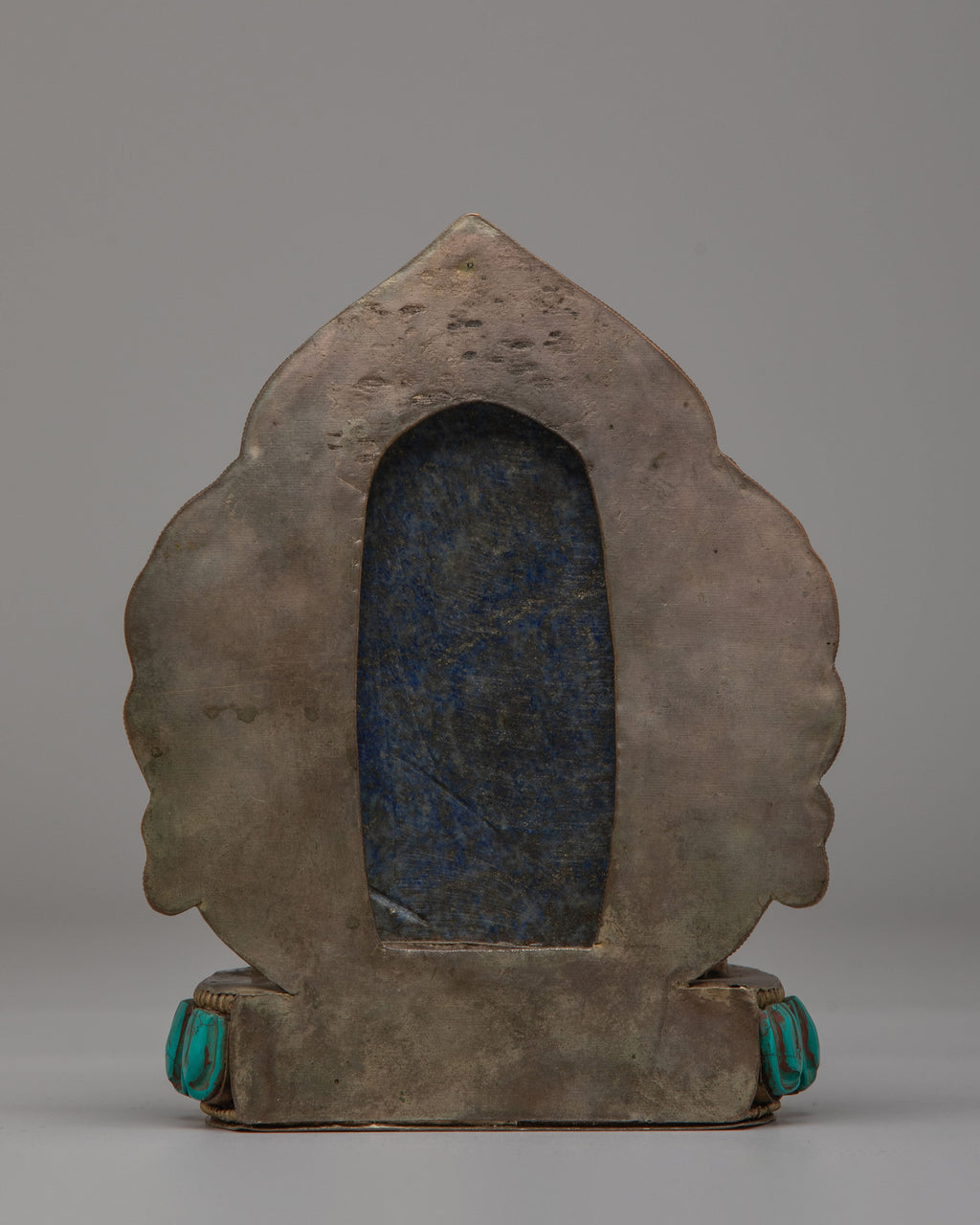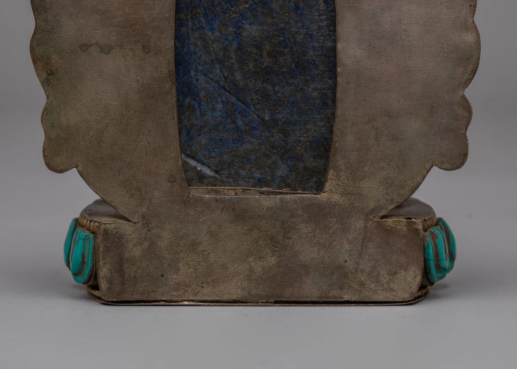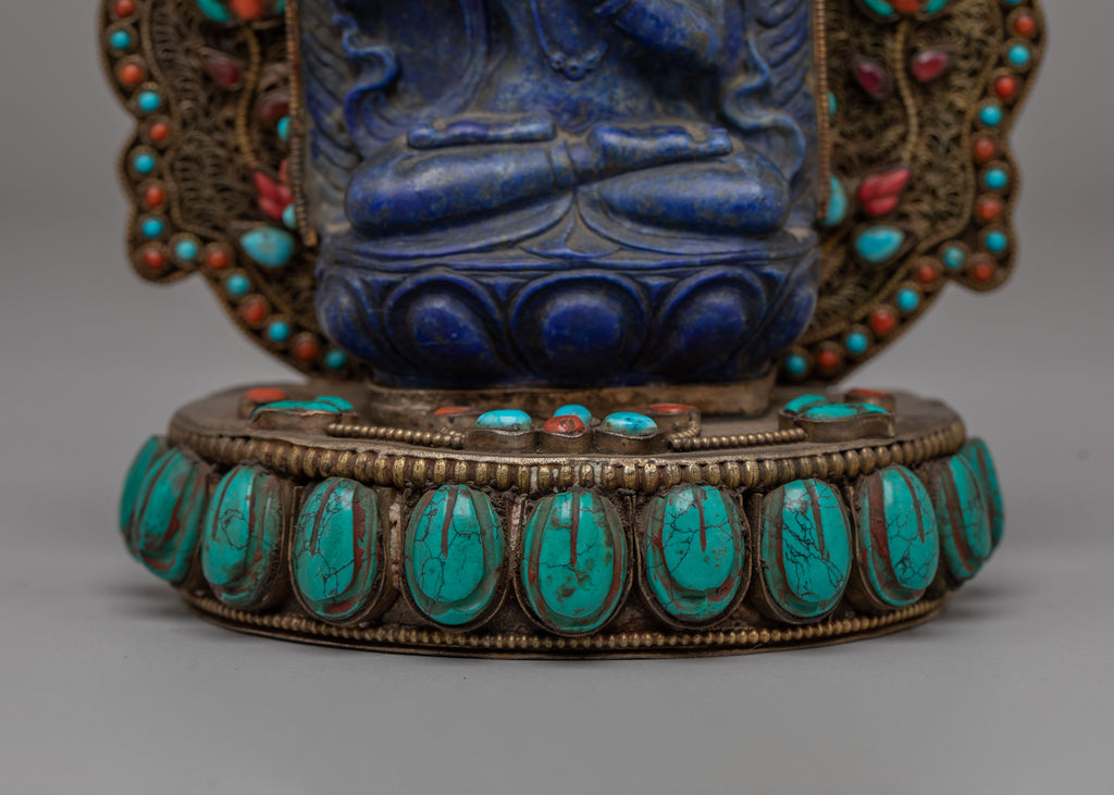 Expertly handcrafted, the statue features a richly polished lapis lazuli body set within an ornate copper framework, adorned with vibrant coral and turquoise inlays. The deep celestial blue of lapis lazuli has long been associated with wisdom, truth, and spiritual depth in Himalayan traditions, enhancing the sacred presence of the figure. The surrounding copper halo is intricately decorated with gemstone settings that add vivid color contrast and highlight traditional Tibetan artistry. Coral accents symbolize life force and protection, while turquoise is believed to attract positive energy and spiritual balance. This rare combination of precious stone and metalwork reflects the refined craftsmanship of Himalayan artisans and elevates the statue as a collector’s piece of Buddhist ritual art.