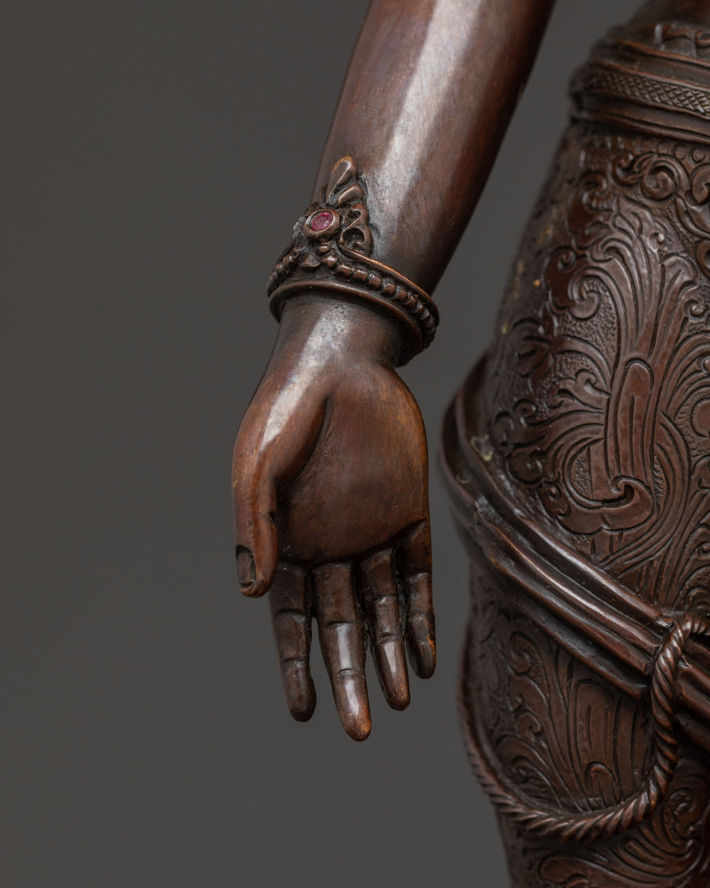 The Himalayan Sculpture of Lokeshwor stands at 16.5”/42cm in height with a 6.1”/15.5cm base and weighs 2.80 kg. It is made from oxidized copper. This statue is perfect for adding a powerful presence to any altar, meditation space, or spiritual collection.