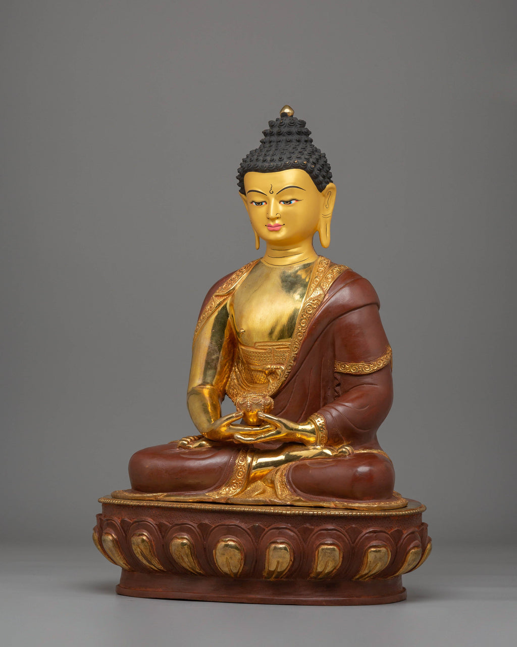The Himalayan Statue of Amitabha Buddha is a stunning representation of Amitabha, the Buddha of Infinite Light and Compassion, who embodies eternal wisdom, peace, and enlightenment. Crafted with meticulous attention to detail, this statue stands 46 cm tall and features a copper body elegantly coated with electro-gold plating. The use of acrylic color enhances the rich, vibrant details, creating a lifelike portrayal of Amitabha Buddha. The statue's golden hues reflect the Buddha’s radiant light, symbolizing the eternal wisdom and compassion he offers to all sentient beings.