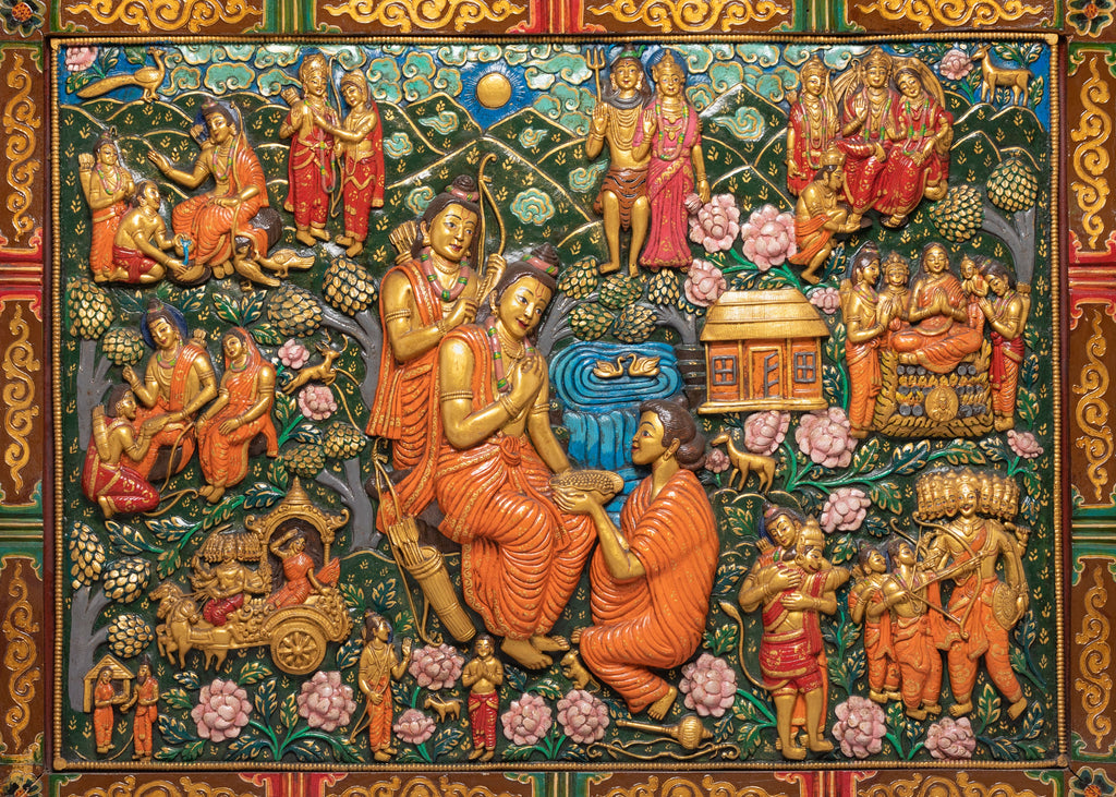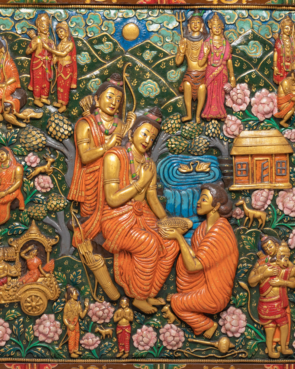 The design is filled with fine textures, temple-inspired carvings, and vibrant classical colors that bring depth and storytelling to the piece. The figures are sculpted with expressive postures and traditional ornaments, creating a visually captivating display that honors the richness of Hindu mythology. The background includes sacred motifs, floral borders, and architectural elements reminiscent of ancient Indian temples. Each deity is represented with their iconic attributes—Ram with his bow, Hanuman in a posture of reverence, Shiva with his serene presence, Parvati radiating maternal grace—ensuring authenticity and symbolic completeness.