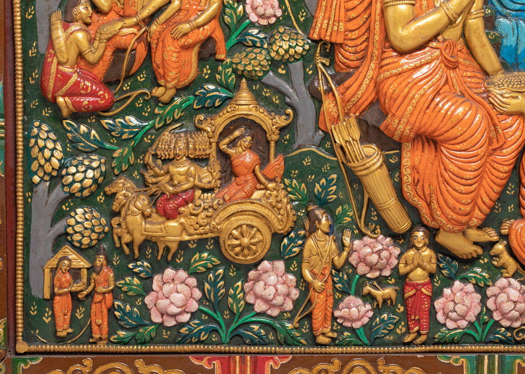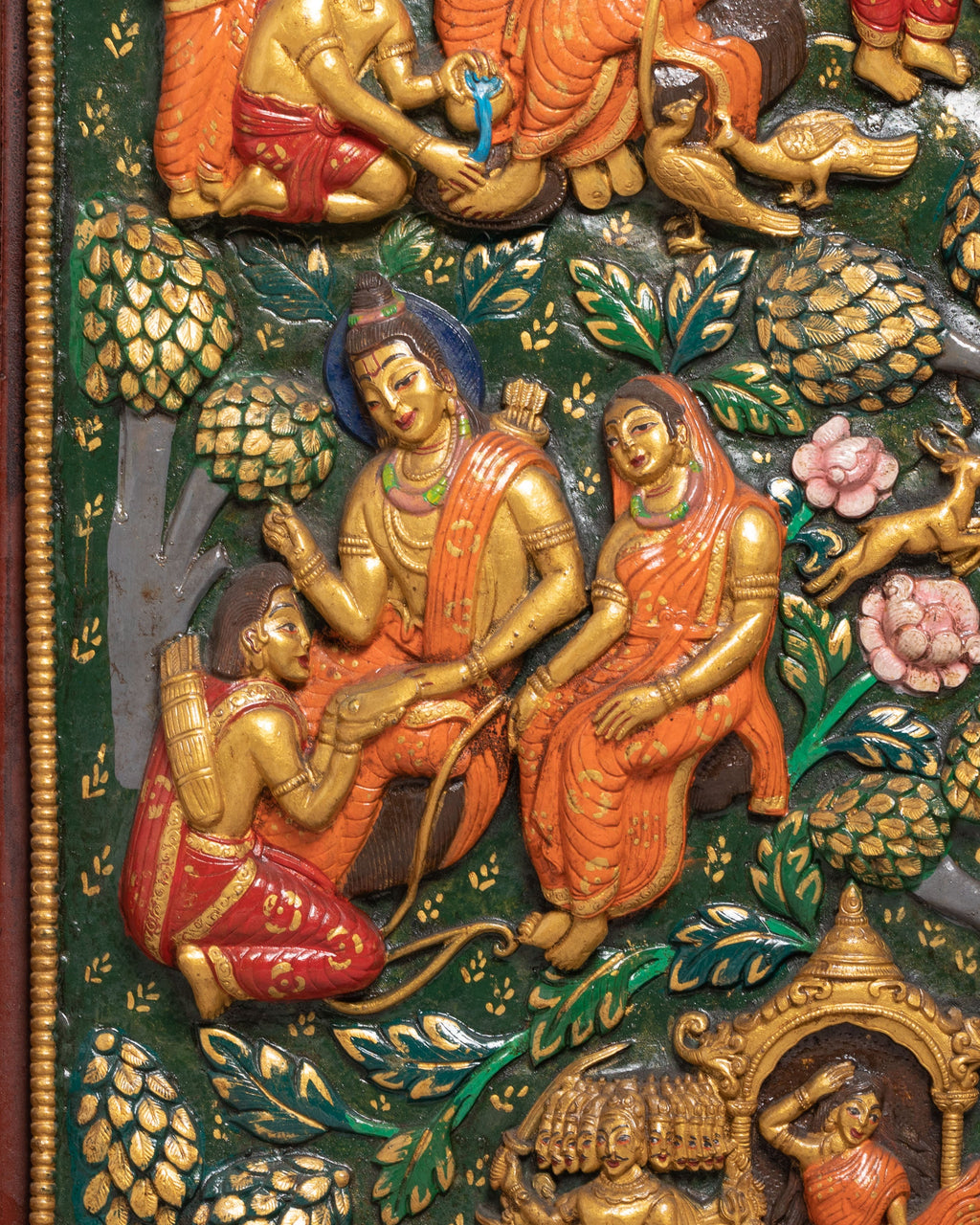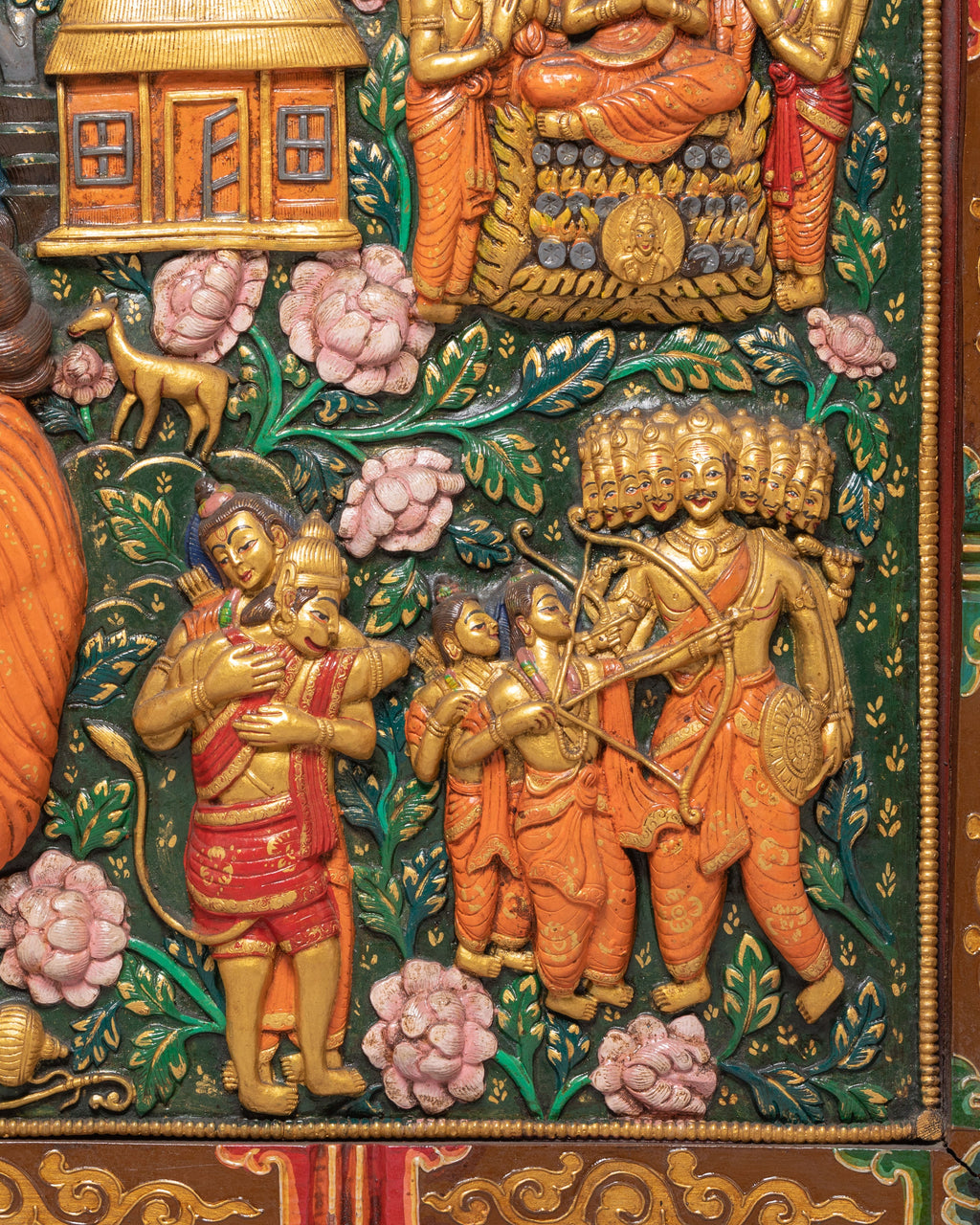 This Hindu Deity Set Wall Hanging is a magnificent portrayal of some of the most powerful and beloved deities in Hindu tradition. Measuring 66cm in height and 88.5cm in width, this masterfully crafted artwork uses stone dust epoxy binding with a wooden back to highlight every intricate detail. At the center of the composition are Lord Ram, Goddess Sita, and Laxman, surrounded by Hanuman, the embodiment of devotion. The artwork also features Lord Shiva and Goddess Parvati, offering blessings of strength, harmony, and divine protection. The presence of Ravan, depicted in his mythological role, brings the epic tale of the Ramayana vividly to life, symbolizing the triumph of dharma over adharma.