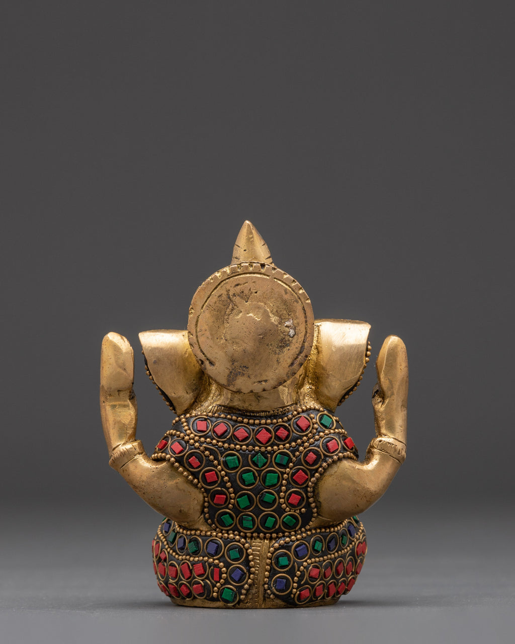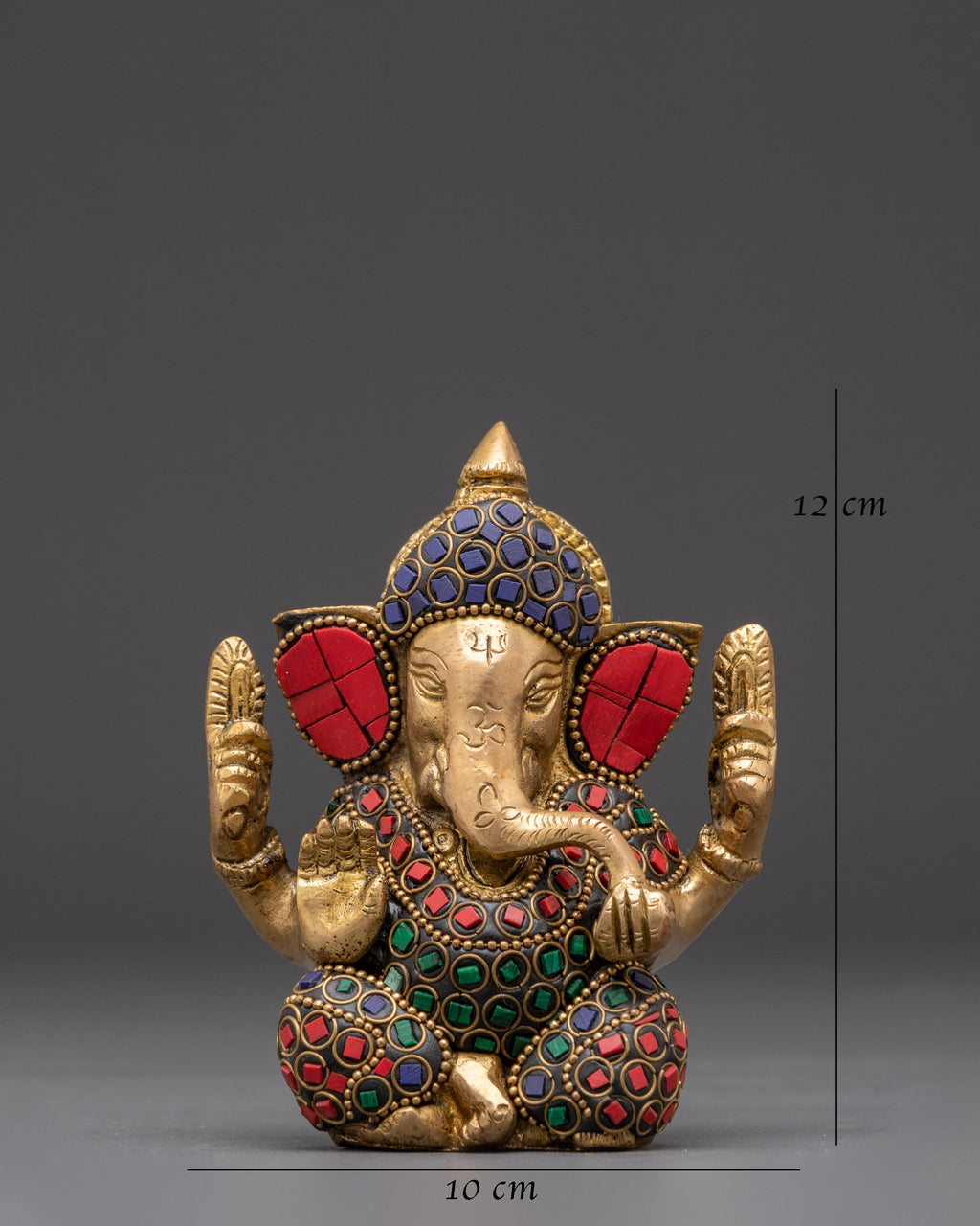 This Hindu God Ganesha Statue is a stunning handcrafted depiction of Lord Ganesha, the remover of obstacles and the bringer of wisdom and prosperity. This sacred piece, measuring 12cm in height by 10cm in breadth and weighing 0.84kg, is made of brass and embellished with coral and turquoise inlays, giving it a stunning, bright finish. Lord Ganesha, the deity of intellect and fresh beginnings, is a popular figure in Hindu culture and an auspicious addition to any home, shrine, or workstation.