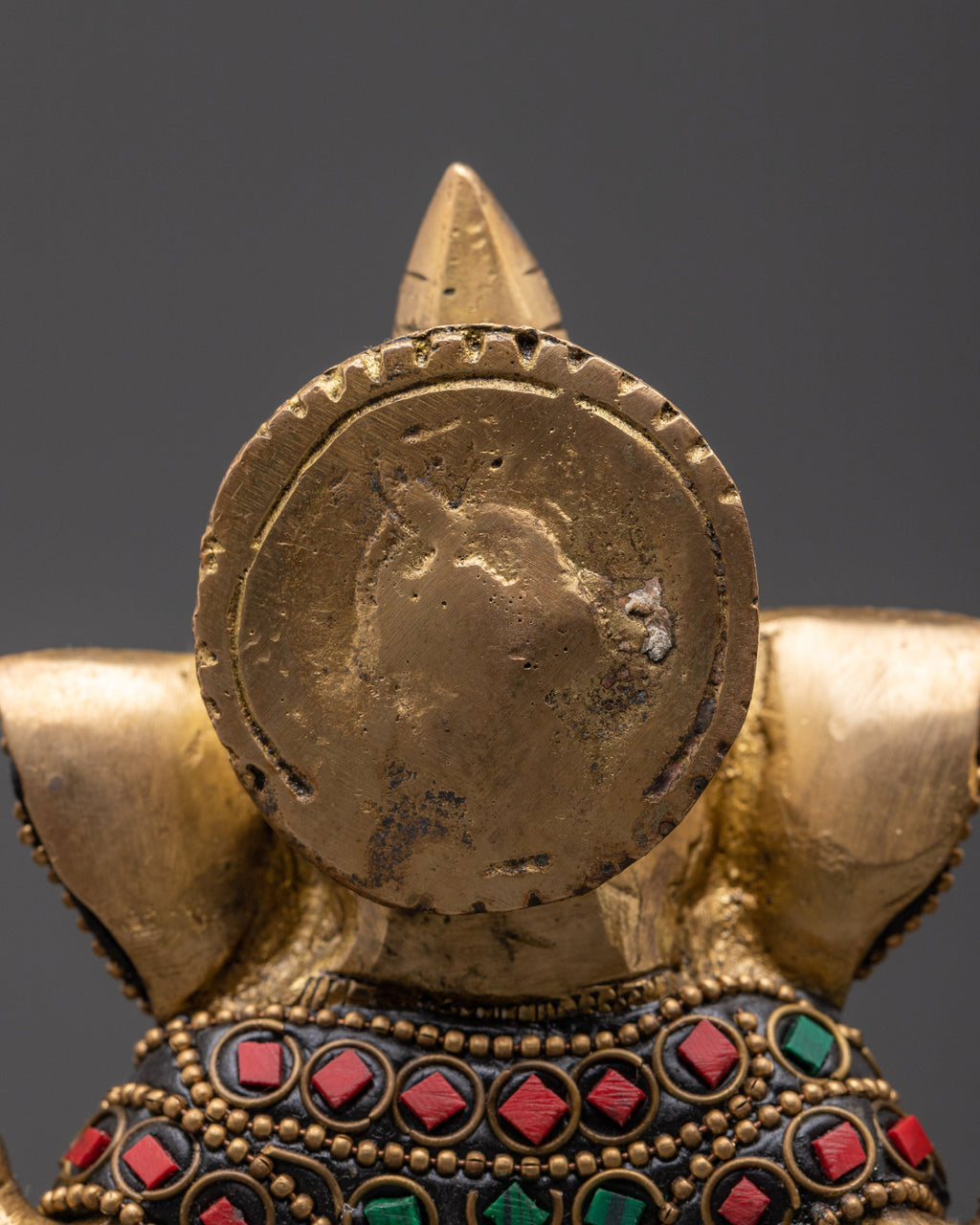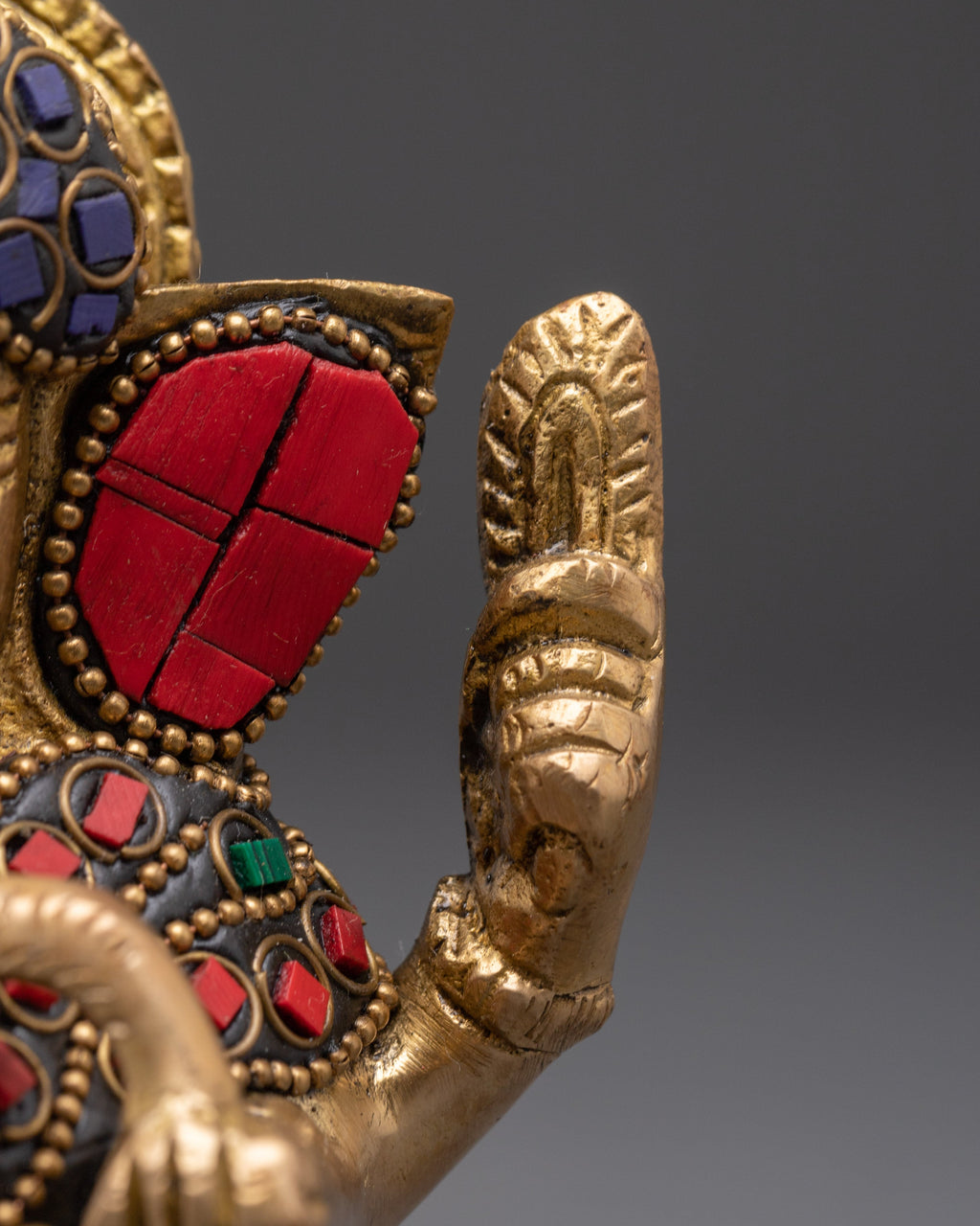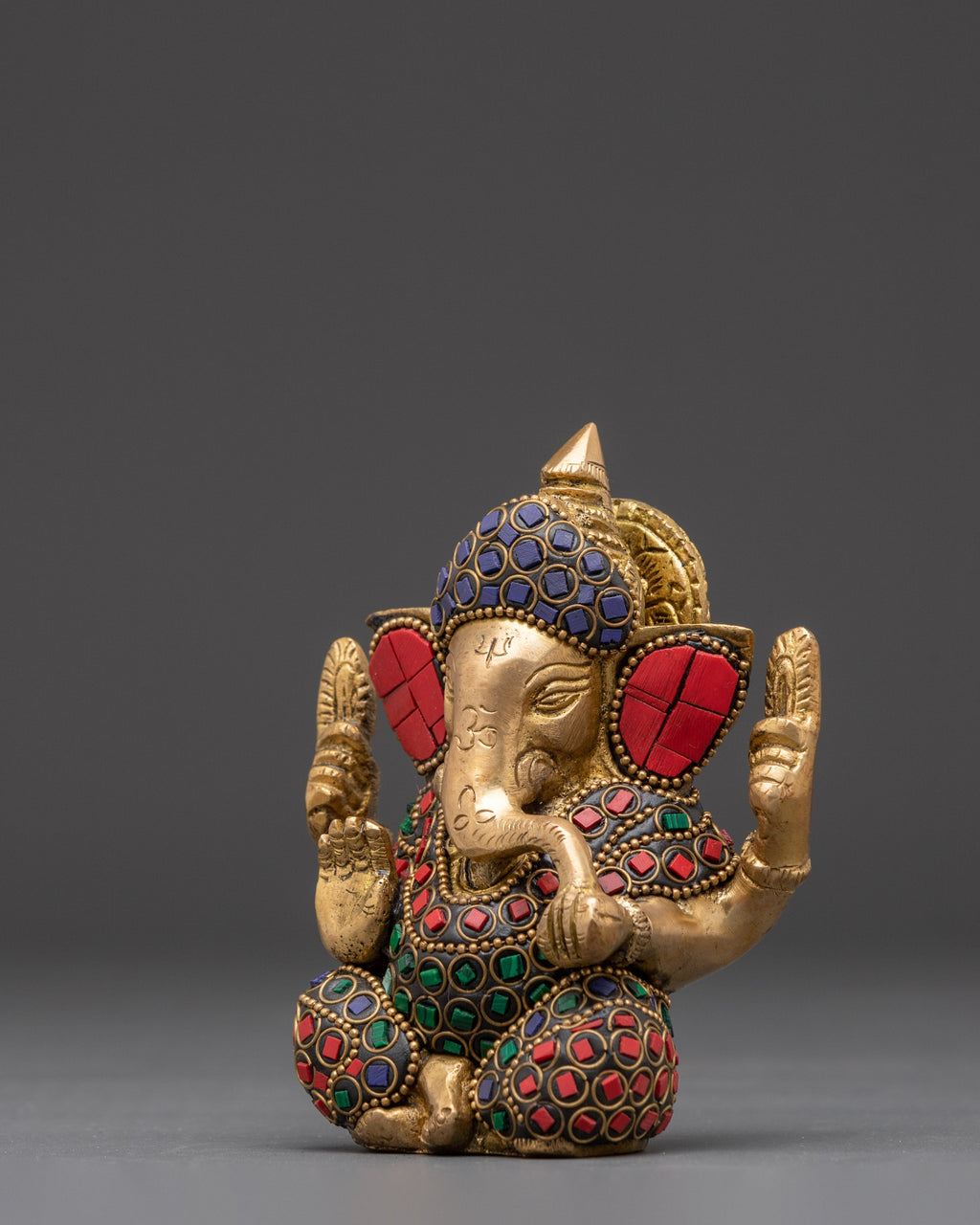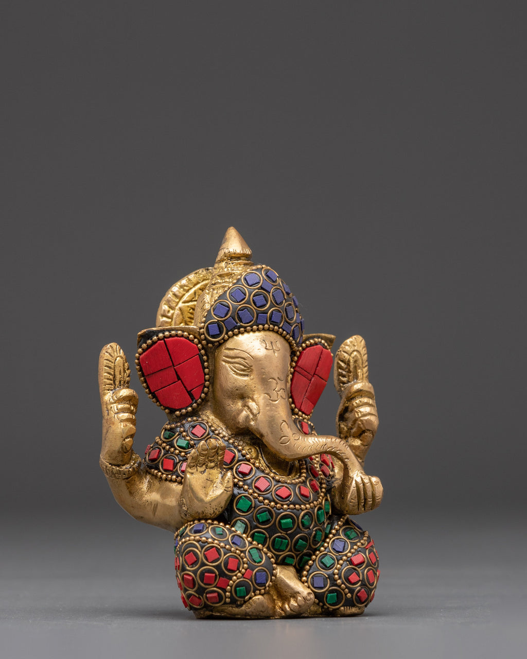 The elaborate design and inlay work showcase incredible artistry. The statue depicts Ganesha in a calm pose, holding sacred symbols in each hand. The turquoise stones indicate peace and spiritual equilibrium, while the red coral inlays symbolize life, energy, and protection. The combination of brass and vivid stones adds to its regal presence, representing the harmonious blend of wisdom and activity, two key attributes for a successful life. The intricate detail on his crown, jewels, and facial expressions exemplifies the breadth of traditional Hindu workmanship.