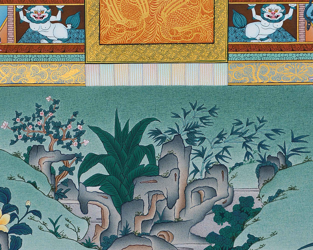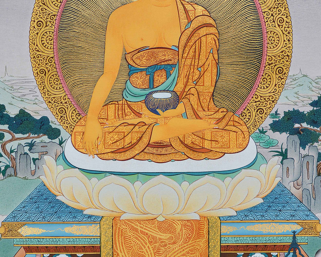 This thangka print features the Historical Buddha seated elegantly on a lotus throne, emanating compassion, wisdom, and enlightenment. On each side are two devoted disciples, representing the continuity of his teachings and respect for enlightened guidance. The Buddha’s hands in mudras symbolize protection, meditation, and teaching, while attentive disciples embody devotion and a desire to preserve his wisdom. The landscape, floral motifs, and auspicious symbols surrounding them enhance the spiritual vitality of the piece. This Historical Buddha Canvas Print symbolizes harmony, wisdom, and devotion, serving as an inspiring centerpiece for meditation, study, or sacred collections.