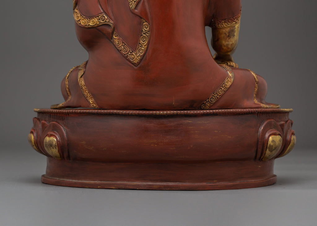 This historical Shakyamuni Buddha figure is a stunning piece of Buddhist art, standing 40cm tall, 27.5cm wide, and weighing 5.85kg. This figure, crafted from rusted copper, exudes an aged quality that evokes the rich legacy of Buddhist craftsmanship. The body is embellished with 24k gold gilding and enriched with acrylic paintings, creating a visually appealing portrayal of Shakyamuni Buddha, popularly known as the Historical Buddha. It is ideal for meditation rooms, shrines, or as a centerpiece in any home, representing serenity, wisdom, and mindfulness.
