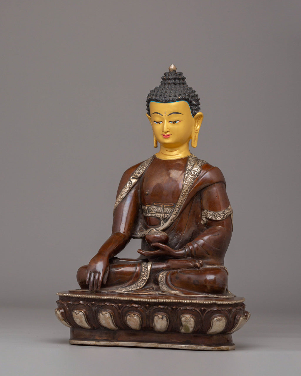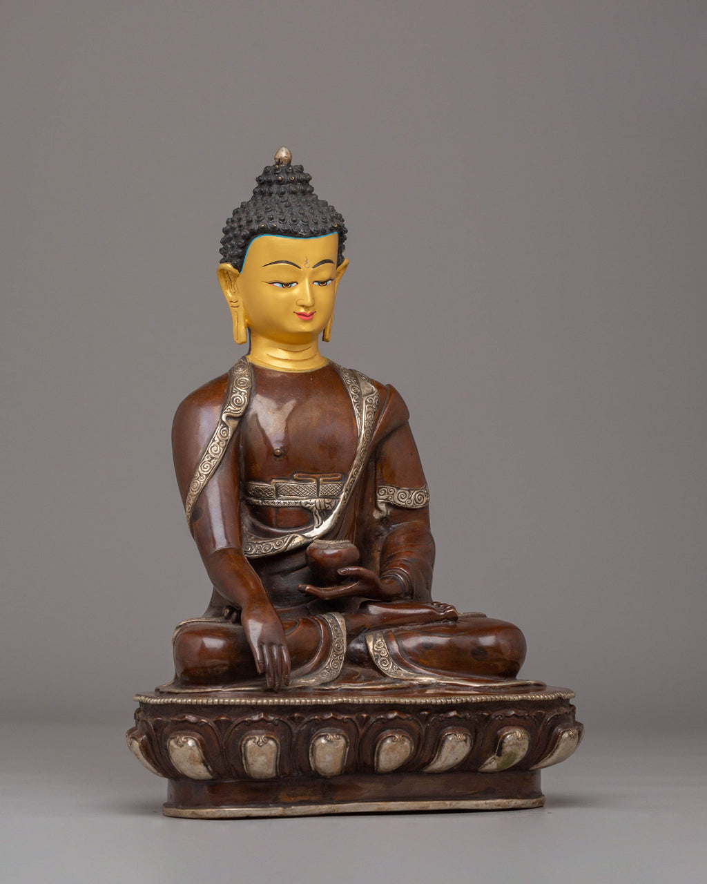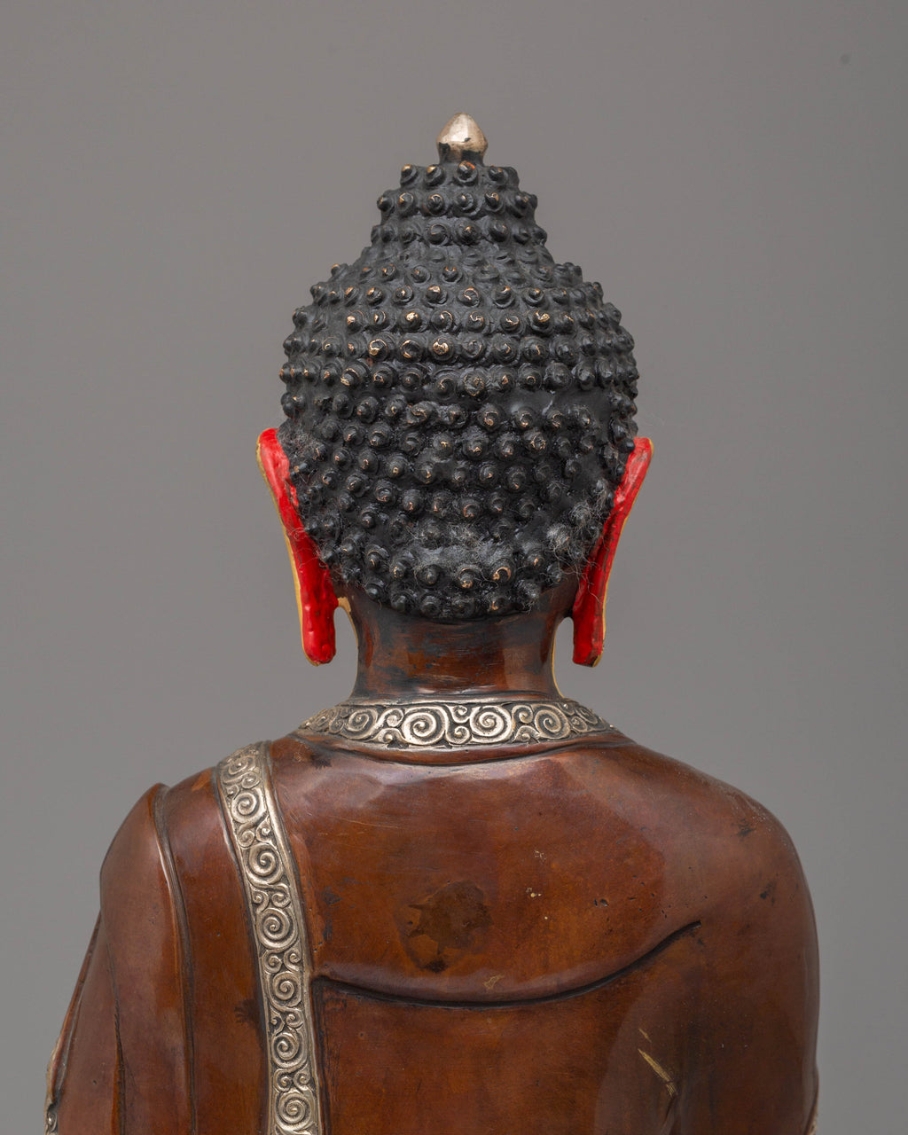 The Shakyamuni Buddha is depicted in a traditional seated position, with one hand held in the gesture of meditation, symbolizing inner peace, tranquility, and the pursuit of enlightenment. The intricate electro silver plating on the robes and gold plating on the crown and jewelry represent the Buddha’s nobility and spiritual wisdom. The detailed acrylic colors enhance the clarity of his serene expression and the flowing robes, bringing life and depth to the figure. The oxidized copper body gives the statue an earthy, grounding feel, reflecting the Buddha’s connection to the material world while promoting spiritual transcendence.