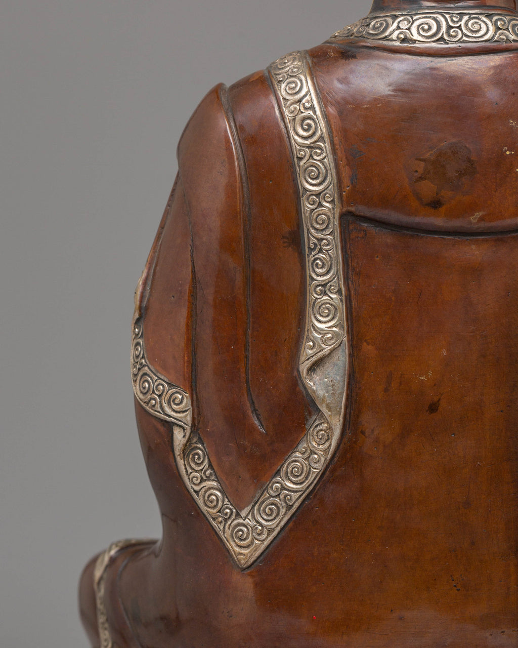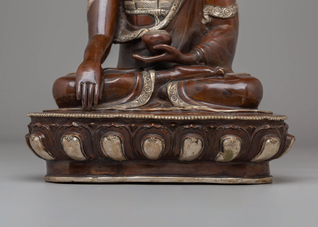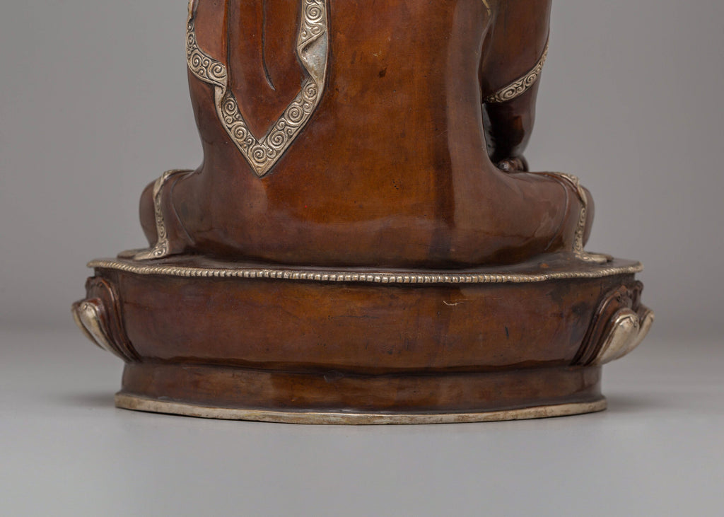 The Shakyamuni Buddha is depicted in a traditional seated position, with one hand held in the gesture of meditation, symbolizing inner peace, tranquility, and the pursuit of enlightenment. The intricate electro silver plating on the robes and gold plating on the crown and jewelry represent the Buddha’s nobility and spiritual wisdom. The detailed acrylic colors enhance the clarity of his serene expression and the flowing robes, bringing life and depth to the figure. The oxidized copper body gives the statue an earthy, grounding feel, reflecting the Buddha’s connection to the material world while promoting spiritual transcendence.