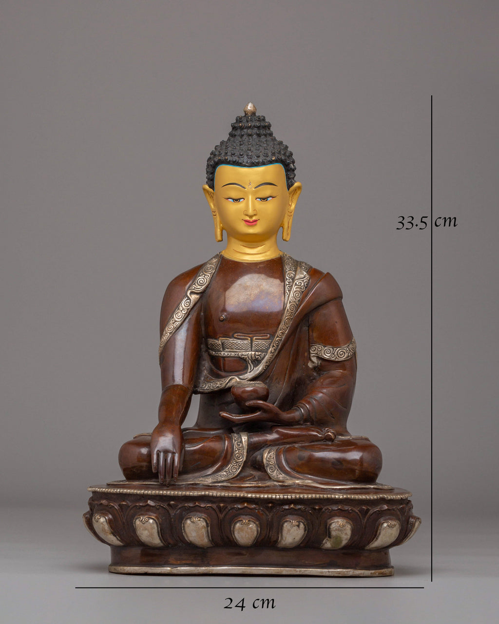 This Historical Buddha Statue of Shakyamuni is a finely crafted piece of art that brings the Buddha's teachings to life. Standing at 33.5 cm in height and 24 cm in width, weighing 3.5 kg, this statue is made of oxidized copper and features electro-silver plating, gold plating, and intricate acrylic color details. The combination of these materials ensures the statue’s beauty while conveying the wisdom and peace that Shakyamuni Buddha represents. This statue is an ideal addition to any Buddhist altar, meditation space, or sacred area, bringing spiritual energy and enlightenment to your home.