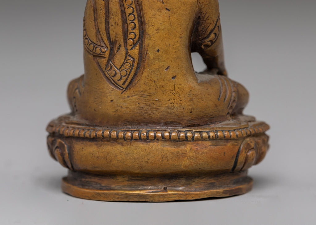 The statue features Shakyamuni Buddha seated in a traditional meditation posture, with his hands in the Dharmachakra mudra (the gesture of teaching). The fine details, from the flowing robes to the serene facial expression, capture the essence of the Buddha’s wisdom, calm, and compassion. The oxidized copper finish gives the statue a timeless, antique look, while the rich patina enhances the intricate carvings on the lotus base, which symbolize purity and spiritual enlightenment.