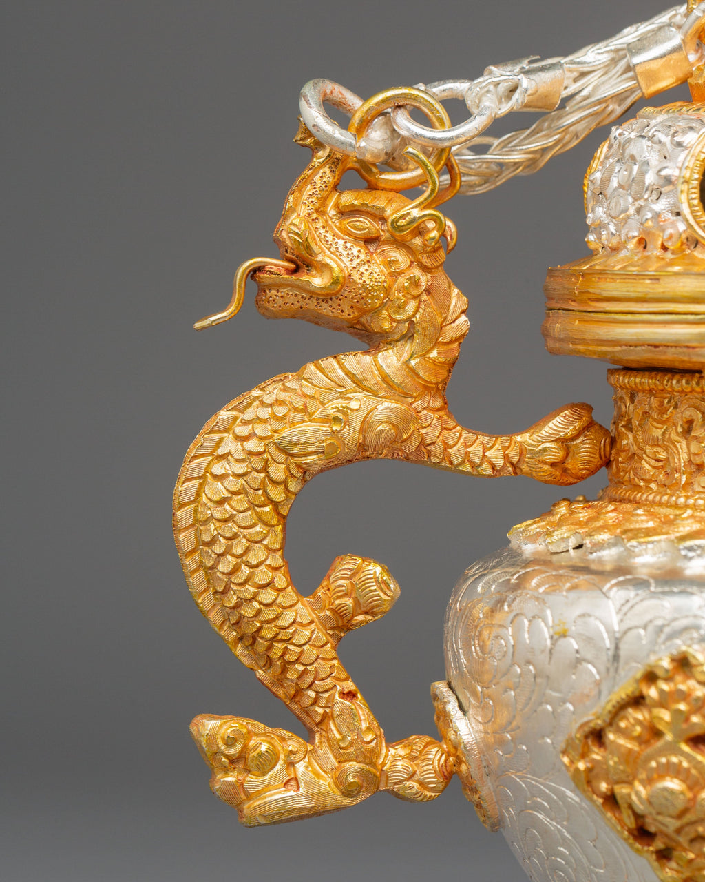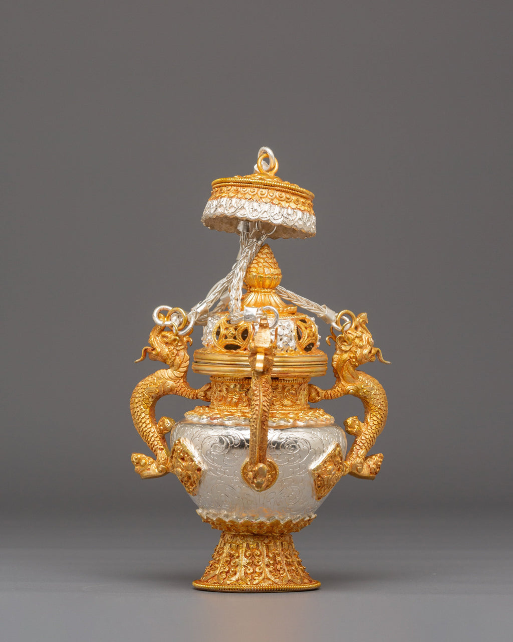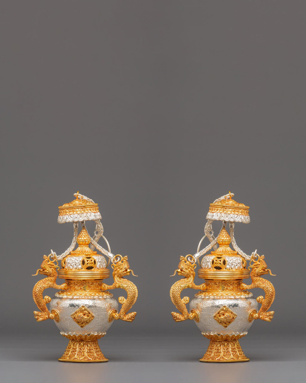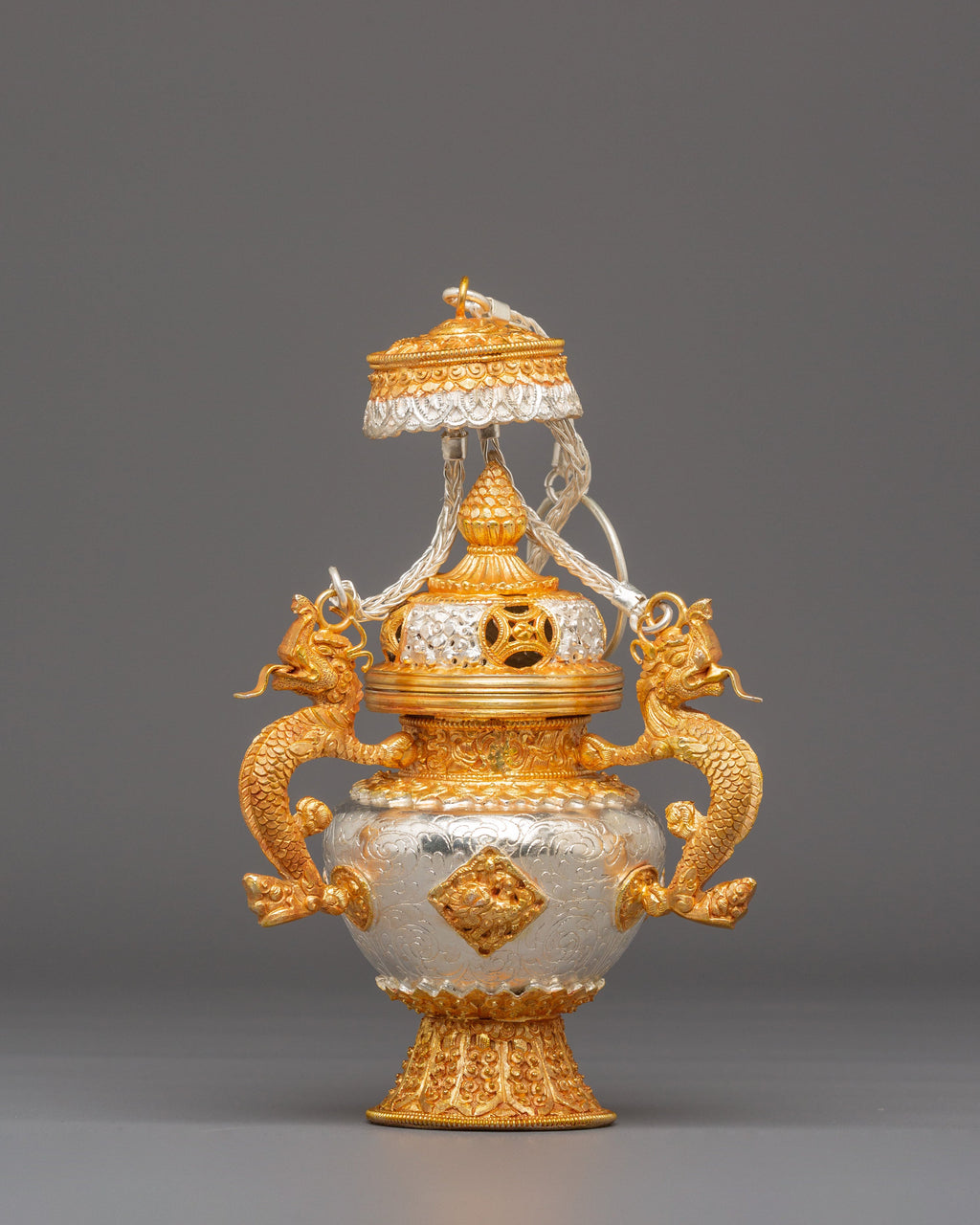 The design features finely sculpted dragon-shaped handles that represent protection, wisdom, and the powerful guardianship seen throughout Tibetan iconography. The body showcases intricate repoussé and filigree work, with alternating silver and gold tones emphasizing the handcrafted detailing. The perforated top lid allows incense smoke to rise gracefully, creating a serene and purifying ambiance. The ornate braided elements that connect the lid and body enhance the ceremonial elegance of the set, making each burner both a functional tool and an exquisite decorative piece.