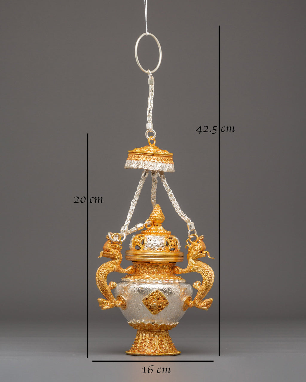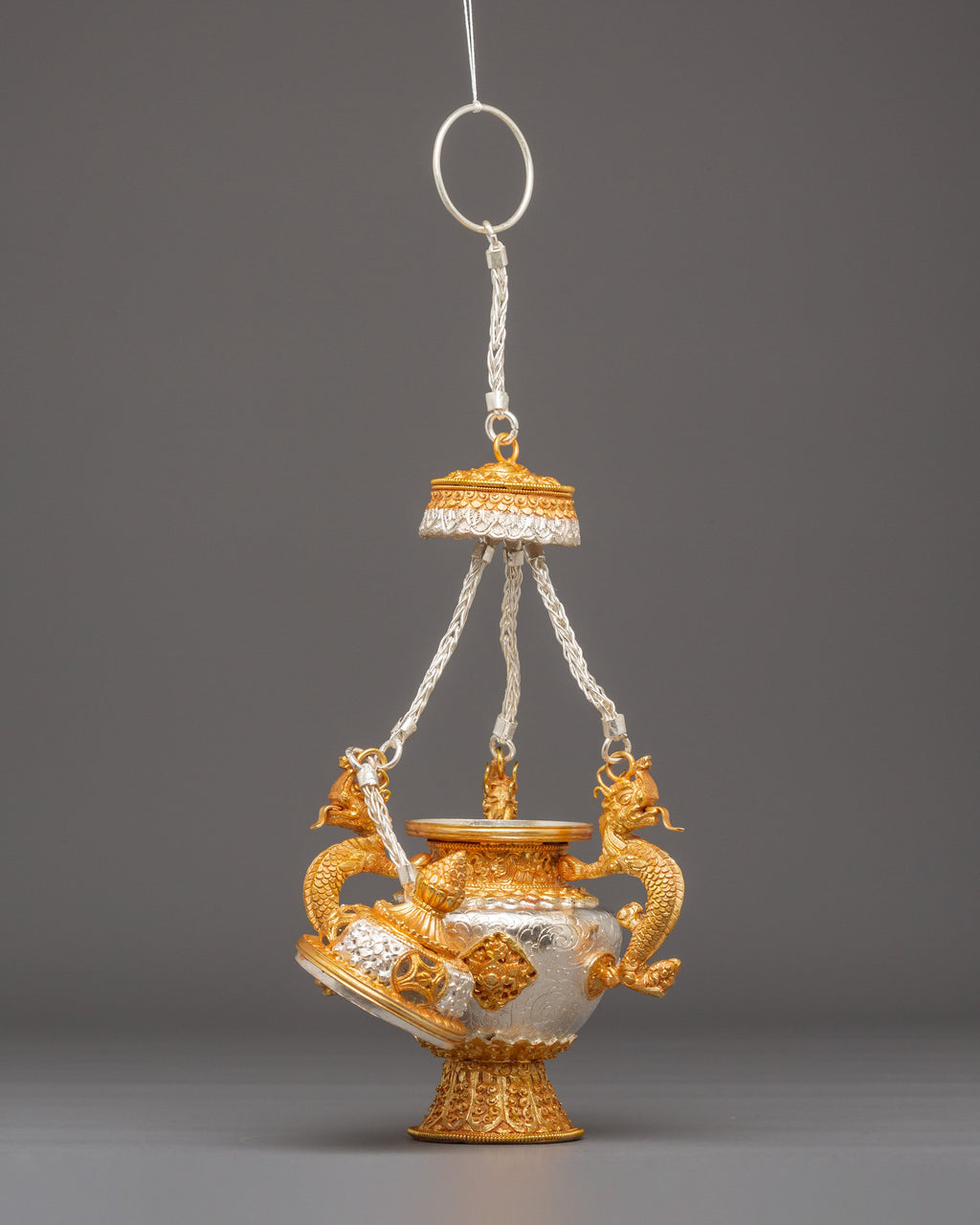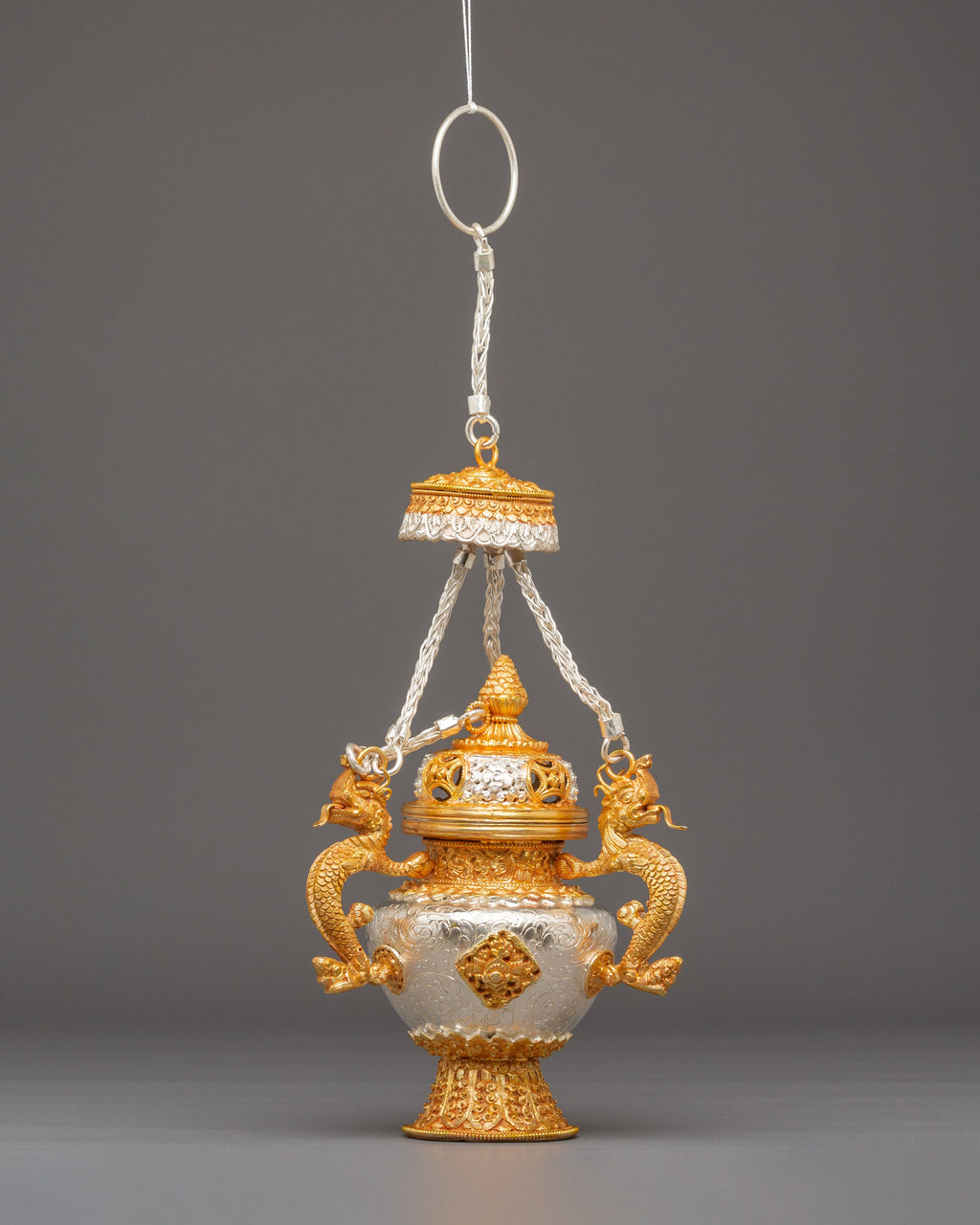 The design features finely sculpted dragon-shaped handles that represent protection, wisdom, and the powerful guardianship seen throughout Tibetan iconography. The body showcases intricate repoussé and filigree work, with alternating silver and gold tones emphasizing the handcrafted detailing. The perforated top lid allows incense smoke to rise gracefully, creating a serene and purifying ambiance. The ornate braided elements that connect the lid and body enhance the ceremonial elegance of the set, making each burner both a functional tool and an exquisite decorative piece.